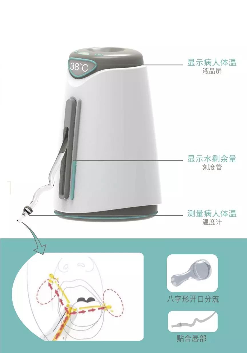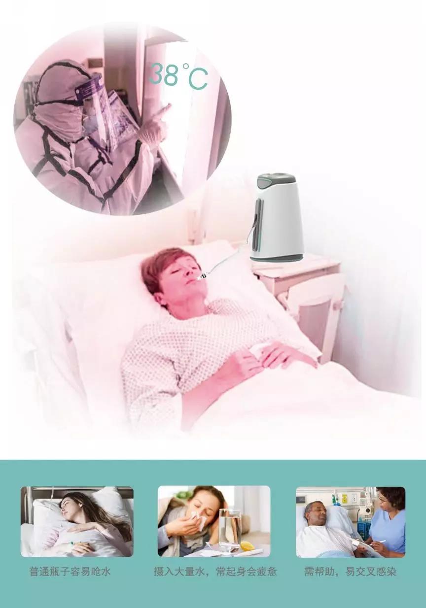 新型冠状病毒具有很强的传染性,患者应尽可能少地与人接触,可减少护理人员及他人被传染的几率。无法起身的患者自理困难,该设计旨在解决患者的喝水问题,减轻医护工作人员的负担。