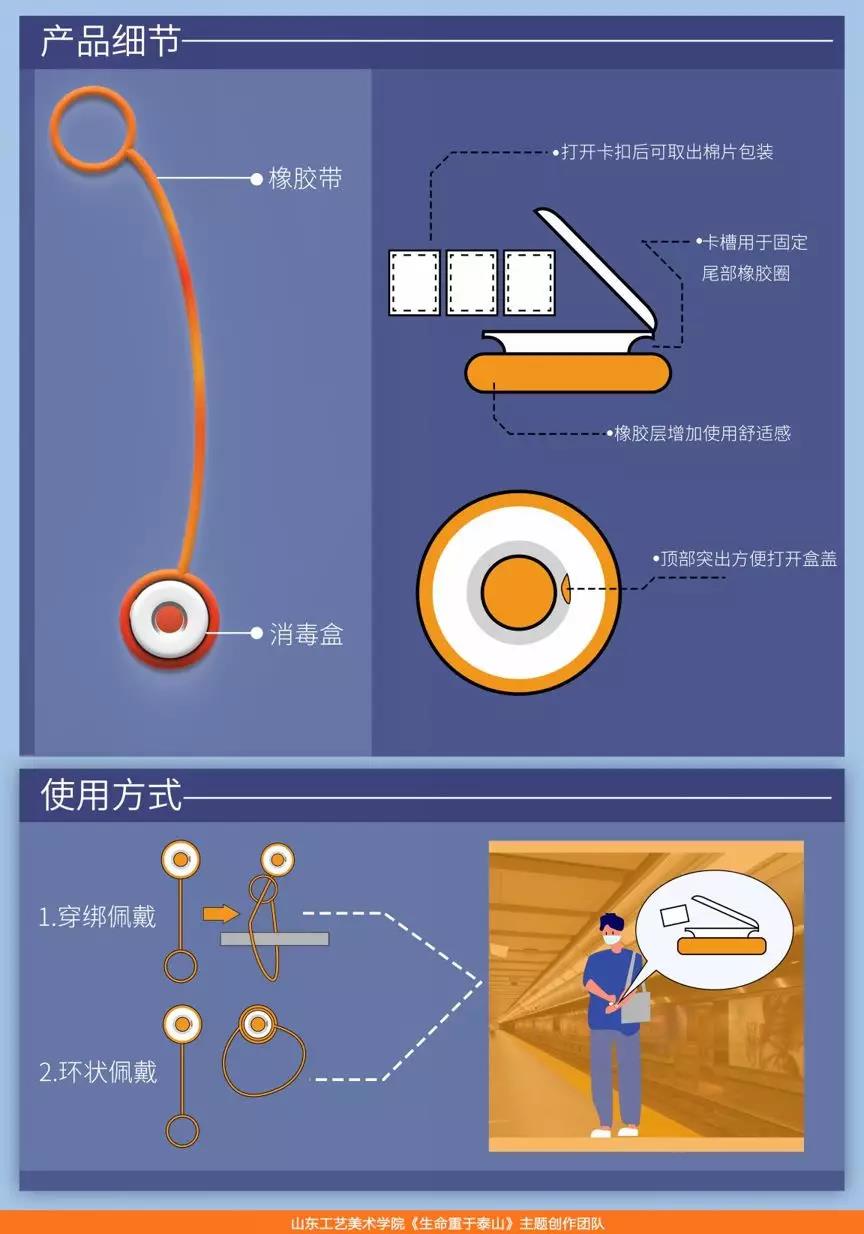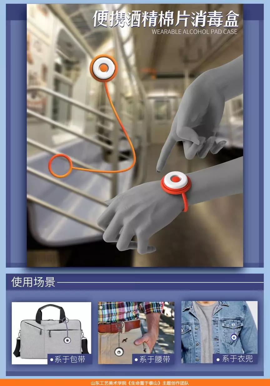 本设计将酒精棉片置于可随身携带的盒中,可以及时清洁手部和手机等随身携带的设备,满足在路途中的应急消毒需求。同时避免了病毒、细菌吸附到衣兜内部和包内物品,最大程度减少接触的物品数量,从而加强中间环节的防控。