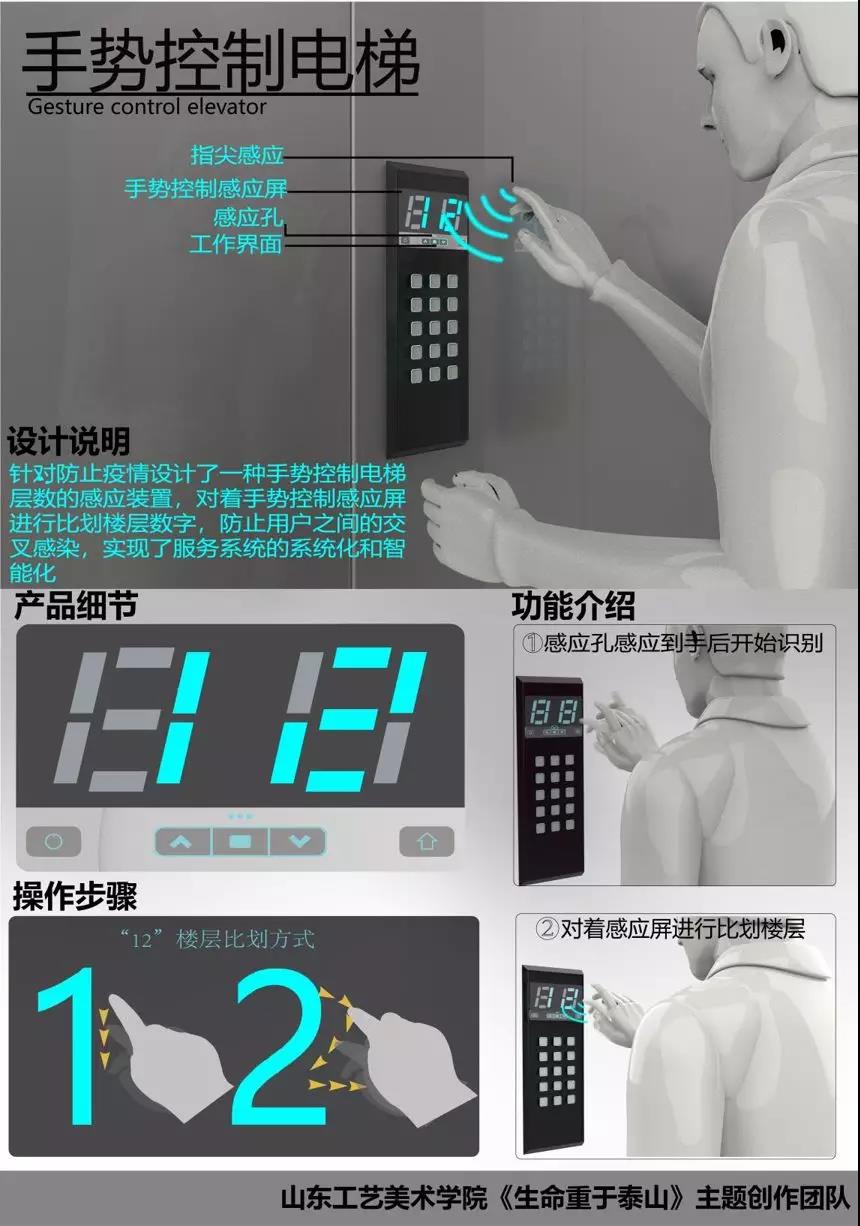 电梯作为本次新冠肺炎病毒扩散传播的重要空间与途径之一,针对性设计了一种手势控制电梯楼层输入的感应装置。用户可面向该装置的手势控制采集器,隔空通过手势动作比划输入相应楼层数字,通过手势识别后,可完成电梯功能的操作。通过该设计可避免用户在使用过程中触碰电梯按键,有效防止公众之间的交叉感染。