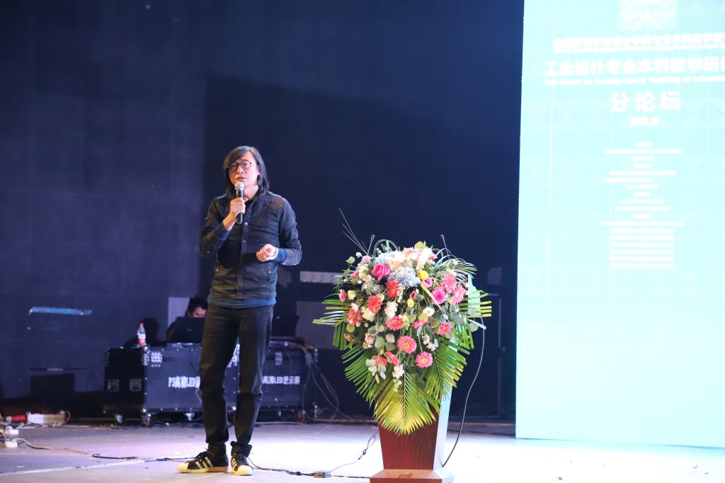 中央美术学院设计学院产品设计教研室徐彤主任以“中央美术学院产品设计本科教学实践思考”为主题发表演讲,讲到中央美术学院设计学院为应对全球变革、全球人才和资源流动、国家创新发展及可持续发展战略等问题,实施了系列教学改革。教改后的教学架构实现了学生由被动学习变为主动学习、师资共享、空间流通开放的转变,新的教学体系以学生为主体、以教师为纽带、以学院为依托。
