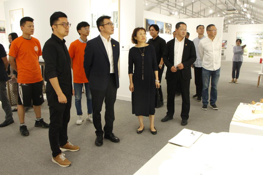 刘宁一行首先参观了正在我校美术馆展出的“第十三届全国美术作品展览艺术设计作品展”。李新向来访嘉宾详细介绍了我校承办第十三届全国美展艺术设计展区的相关情况,并向来宾介绍相关作品的设计理念、材料运用、工艺手法等,引起嘉宾极大兴趣。刘宁就展品的设计理念、材料选取、艺术风格、实际应用等与展区负责人进行了深入交流,高度评价我校在全国美展中取得的巨大成绩,以及对全国设计艺术领域作出的巨大贡献。