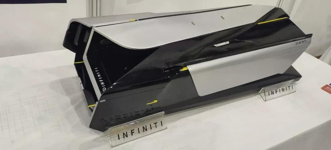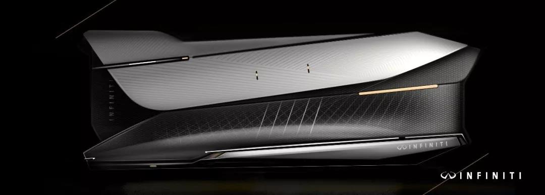 汽车前部空间的扩展模块可以伸出车体,可以增加一个休息平台,当完全与车身分离时则可单独成为一张躺椅,延伸空间多维度的自由转换。左侧车顶利用可形变的有机材质,当使用者坐上去时,转换为座椅的形式,实现内饰向外饰的形式转换,同时根据使用者的需求可上下抬升,增加纵向维度的空间。整合的模块化设计带来了更多的娱乐功能。通过几何化造型语言的运用,将两个内饰空间分为两种不同形式,突出性别“专属”设计主体。利用不对称的设计手法,将感性曲面与理性几何型面有机的结合在,凸显英菲尼迪品牌的造型趋势。