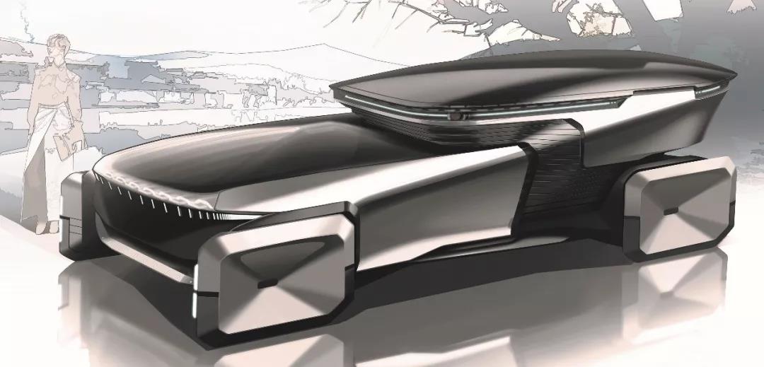 徽派建筑是典型的东方特色建筑,银版相机则是西方摄影技术的开端,在两者中寻找共同点,将传统的东方文化与西方新兴技术相融合,用“星际几何”的设计理念进行造型重塑,将徽派建筑群落重构为具有未来感的几何形态并将相机的独特结构运用到车身中,凸显徽派建筑群落布局紧凑善于利用组合空间、方寸之间可见天地的特点。整车分为前后两个座舱,前端是休闲空间,当旅行摄影师灵感来临时,将车辆设置为自动驾驶模式,座椅向后滑动进入摄影舱,轨道上的摄像机将周围环境投影成像至舱内,摄影师通过手持终端在舱内进行拍摄和后期处理,并可分享到休闲空间的舱壁上。位于前脸的毫米波雷达能够探测前方的地形结构,座舱的连接结构与方形轮罩中隐藏着主动升降悬架。市区模式悬架缩紧压低车身姿态,更符合城市风格。越野模式下车辆根据前方路况自动调整座舱悬架姿态,让摄影舱始终保持水平状态,同时行驶部分的悬架行程增长,提高底盘离地间隙,增强越障能力,保障摄影工作平稳进行。