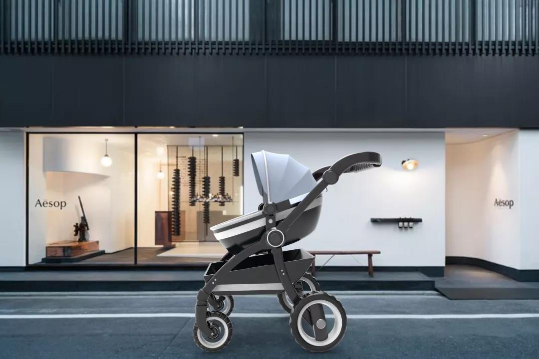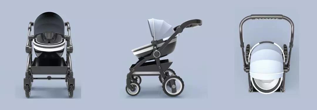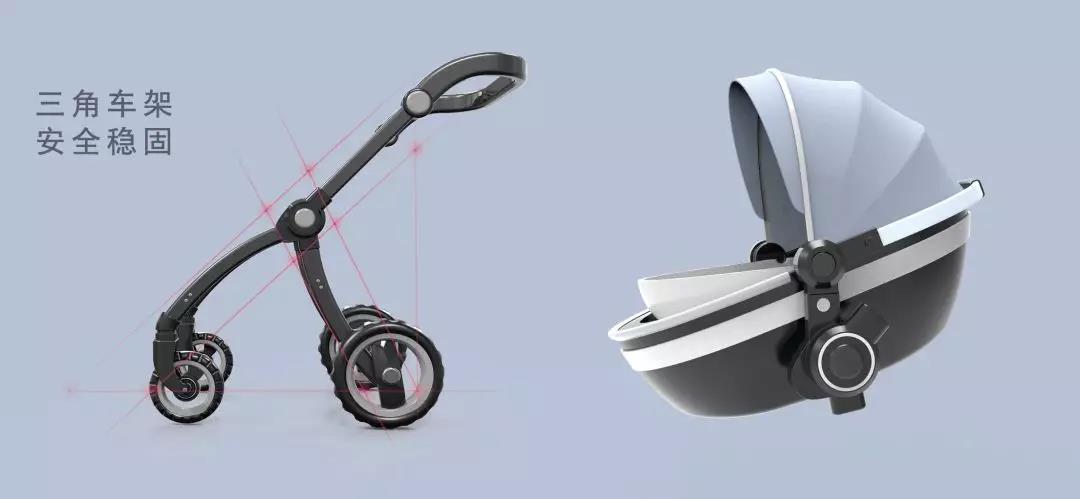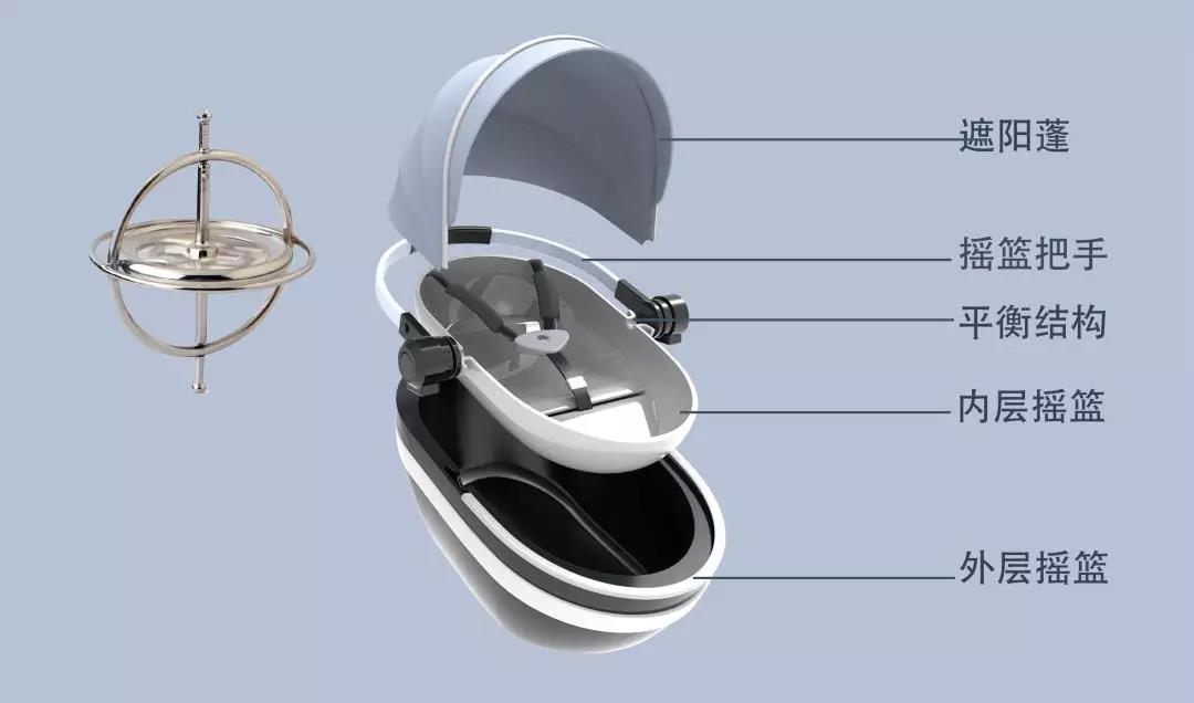 婴儿车的宝宝摇篮分为同轴的内外两层,外层随外力的颠簸而摇动,但内层因运用陀螺仪与重力感应相结合的原理,可始终保持平衡,使婴儿车内层摇篮不受颠簸而晃动,有效减少外力作用下导致宝宝在摇篮中的颠簸晃动感。