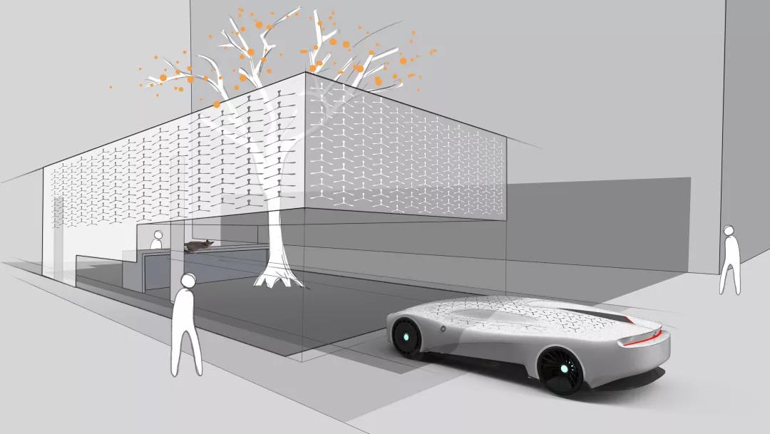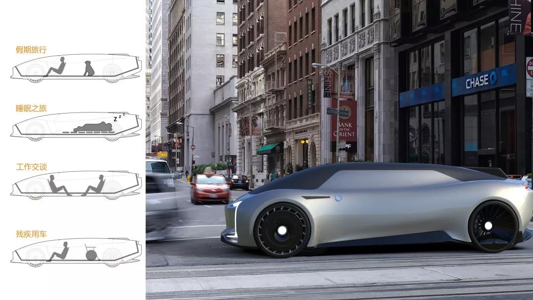 本汽车为概念型自动驾驶旅行车,将流体雕塑与出行融为一体,围绕舒适安全来扩展功能。