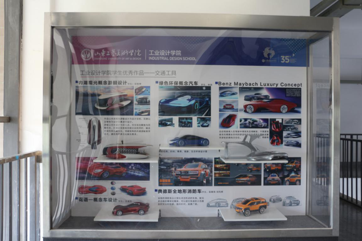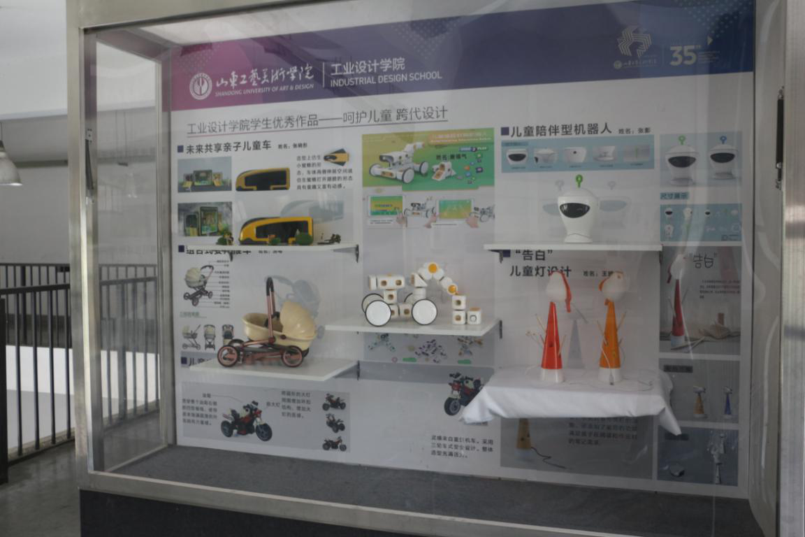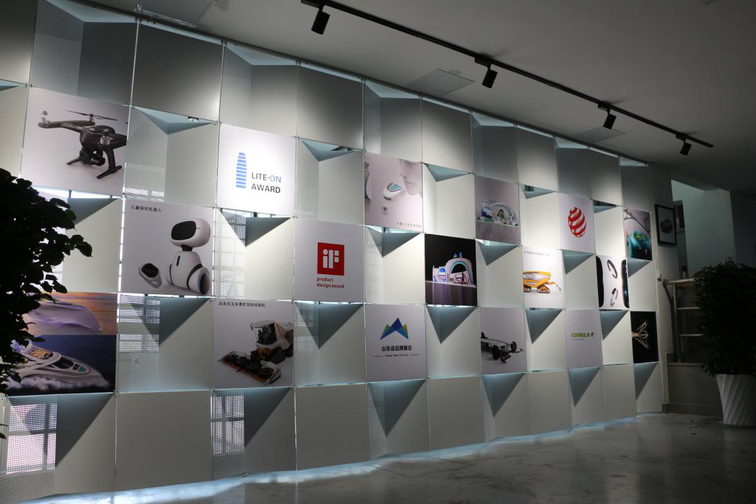 工业设计学院教学办公空间优化从以下三个方面开展。首先,在教学楼设置教学展柜,重点展示往届毕业生的毕业作品及模型,宣传学院的专业优势。其次,在学院办公空间的公共区域增加作品展示墙,用以展示近期获得国内外大奖的学生作品,展示学院的教学成果。最后,在学院办公空间的休息区域张贴工业设计学院logo立体贴,展现学院形象。
