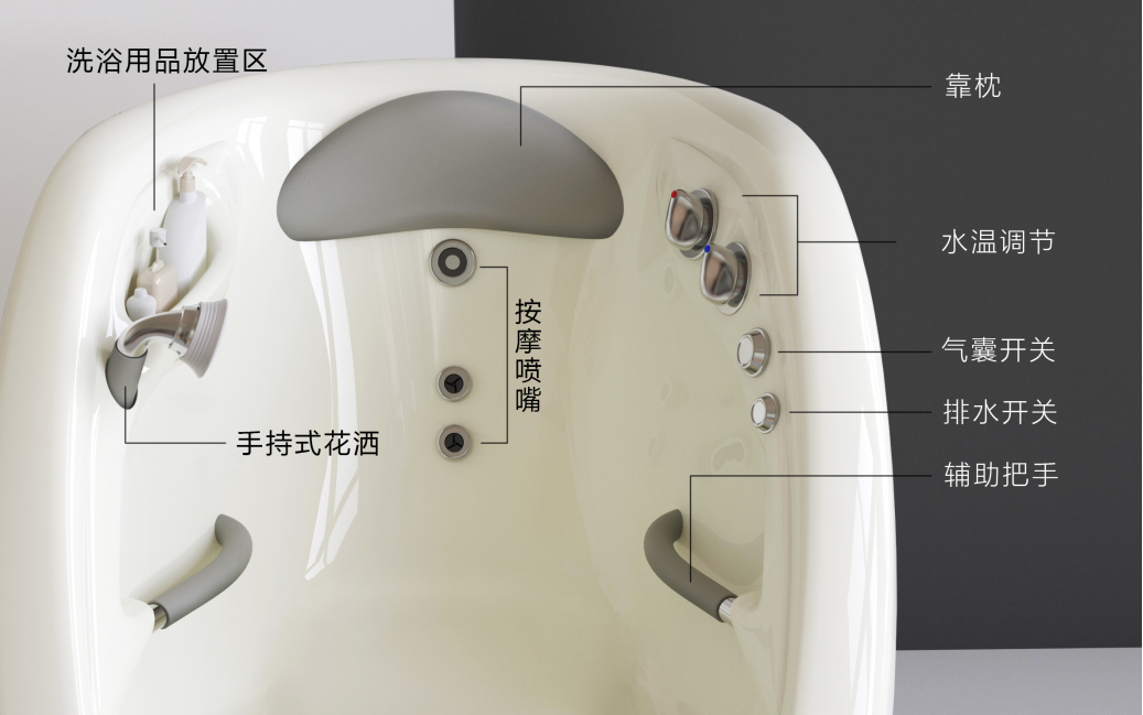 围绕浴缸内空间的全包裹形态,设计有洗浴用品放置和操作区域,洗浴者不必移动即可应对洗浴中遇到的各种情况,解决了长久以来困扰老年人因四肢机能退化而洗浴不便的难题。