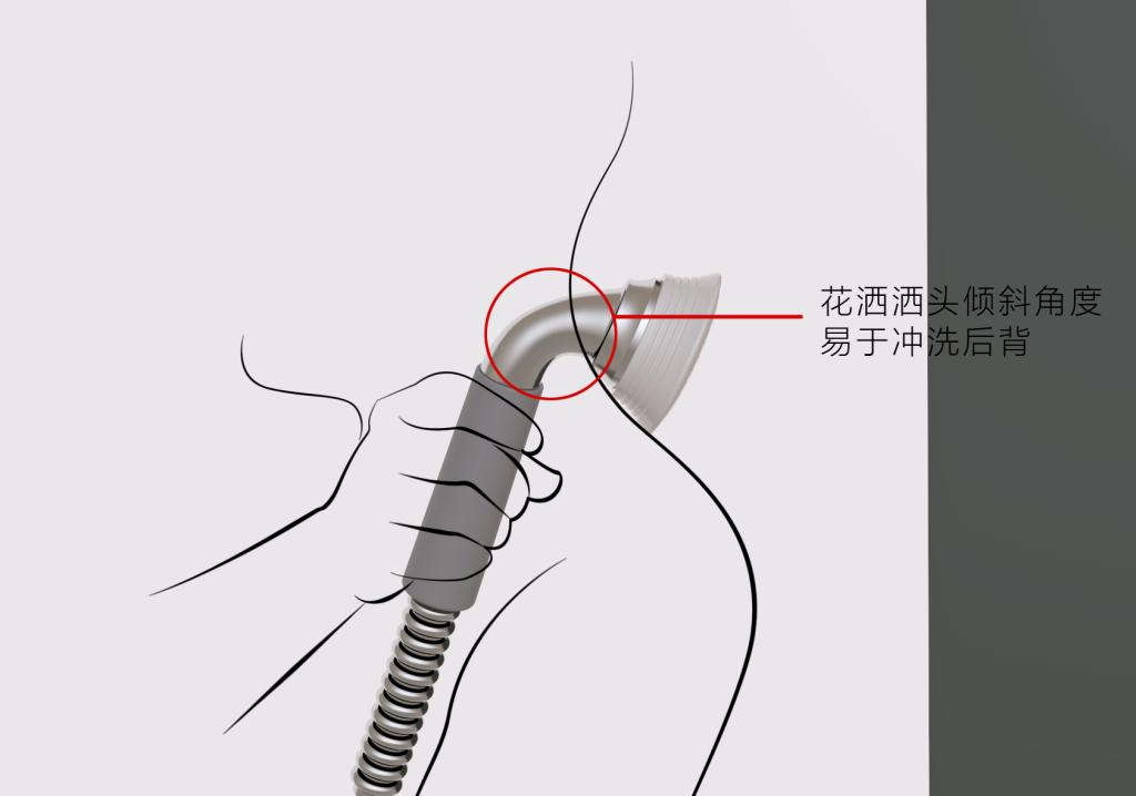 手持式花洒的洒头根据人体肩部曲线进行设计,使老人无需将花洒伸到背后也能方便冲洗。花洒的抽拉方式便于水管的收纳整理且水管不会外露,保证老人在洗浴过程中不会被水管绊倒,更加安全。