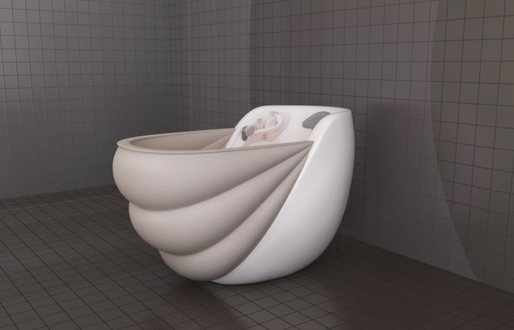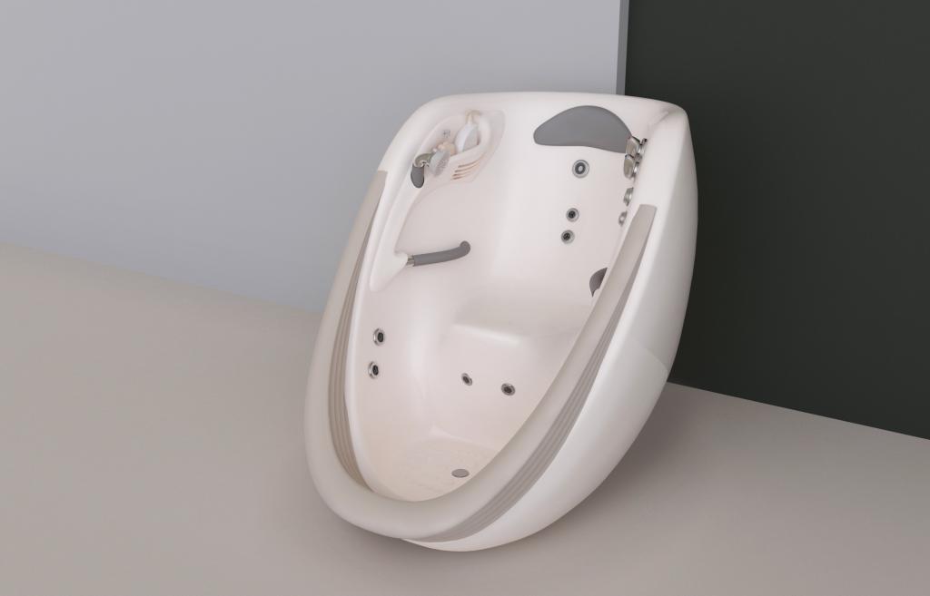 外观上,采用“海螺”的设计造型,亲切、富有温度感,符合老人洗浴时需要安全感的需求;功能上,浴缸前端结合现有的充气式气囊技术,有效解决老人进出浴缸不便的问题,在进出方式上有较大创新。