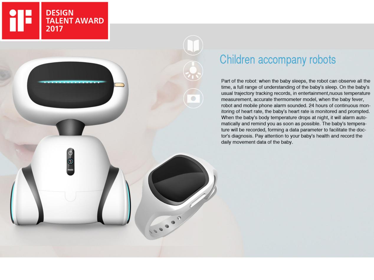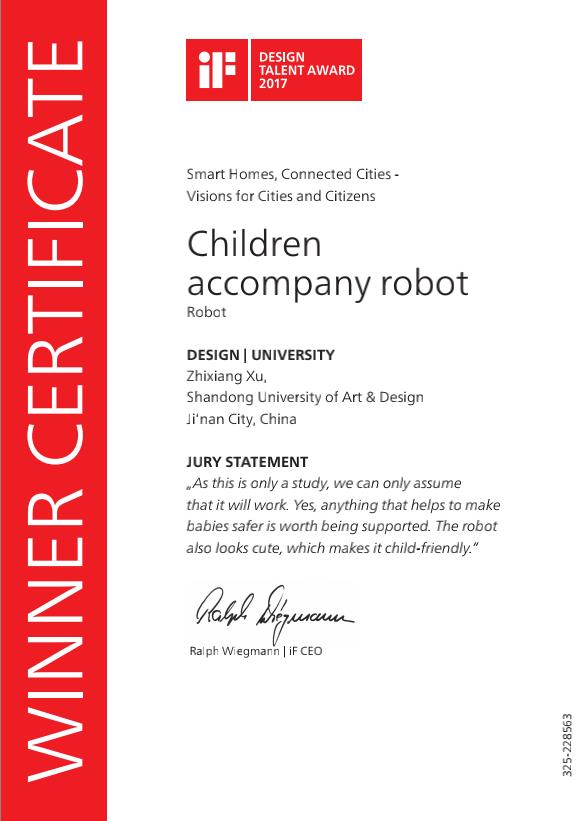 近日,2017年德国IF国际设计竞赛获奖名单已经公布,工业设计学院交通工具设计专业徐志翔同学的作品《儿童陪伴机器人Children accompany robot》荣获IF设计新秀奖(IF DESIGN TALENT AWARD)。