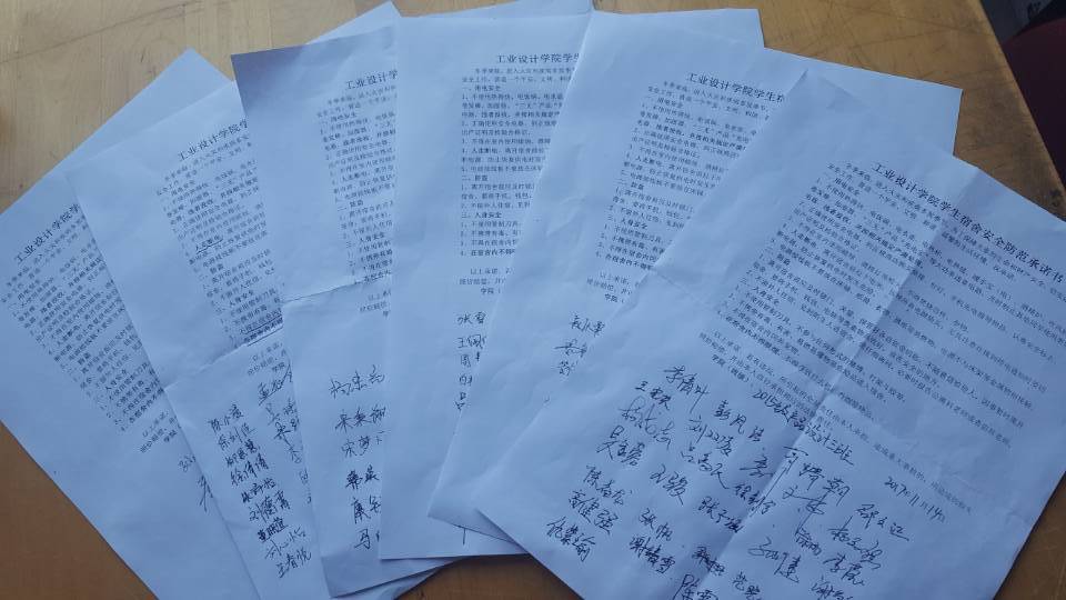 晚上,四个年级的同学在各班教室分别召开了班会,并以班级为单位,在《工业设计学院学生宿舍安全防范承诺书》上签字。