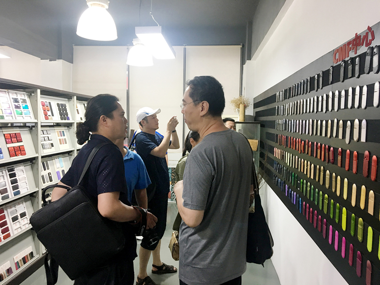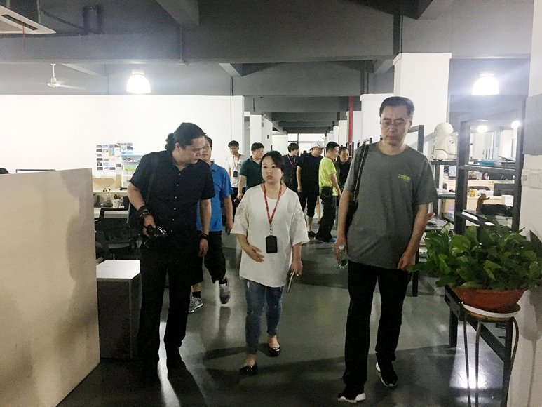 随后李经理带领人才培养方案考察组参观了浪尖公司,实地考察了设计师的工作现状以及公司环境,浪尖希望新入职的设计师从材料、模具、装配等多方面来考量设计,而不仅仅是造型,所以公司内部设有CMF中心,考察组也对CMF中心进行了深度参观和考察。