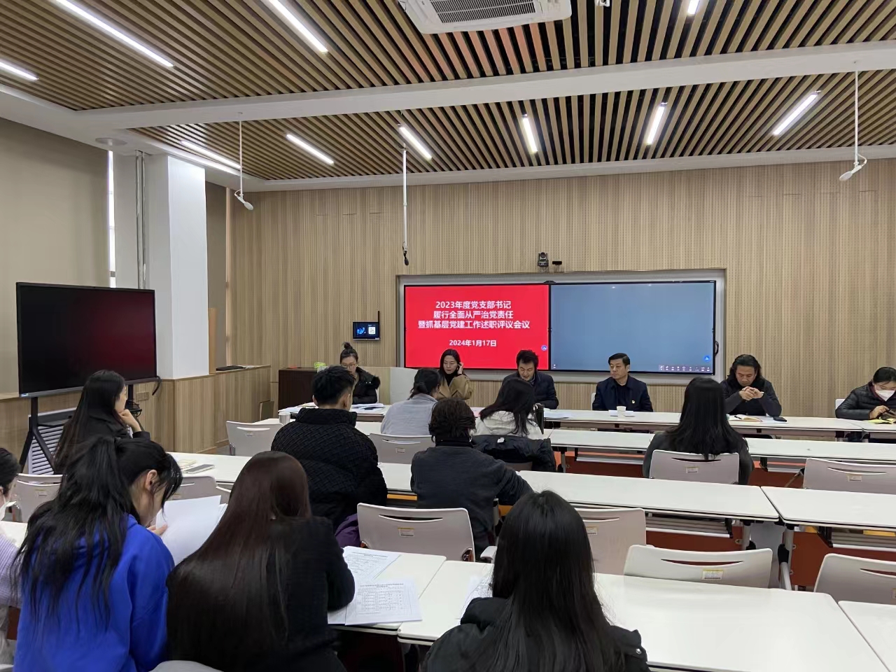 2024年1月17日下午,服装学院党总支召开2023年度党支部书记履行全面从严治党责任和抓基层党建工作述职评议大会,会议由党总支书记杨磊主持,学校党委委员、纪委书记、监察专员谷朝勇莅临指导会议。