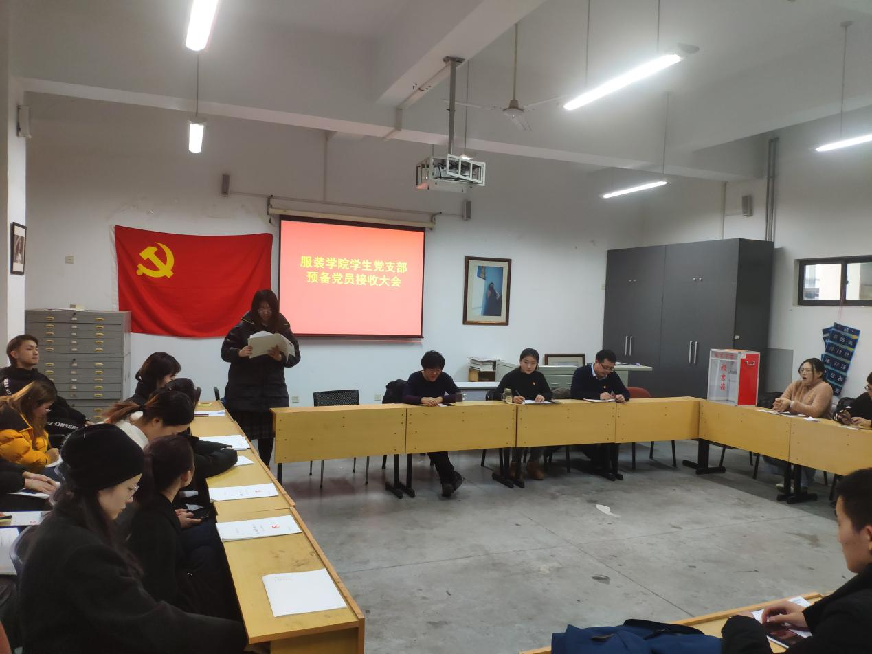 2019年12月26日下午,服装学院学生党支部在多媒体教室召开预备党员接收大会,讨论是否接收李俊洁等十一位同志为中共预备党员的问题。会议学生党支部书记王苏主持,党总支副书记王金安及支部党员参加会议,服装学院党总支书记张利列席会议。