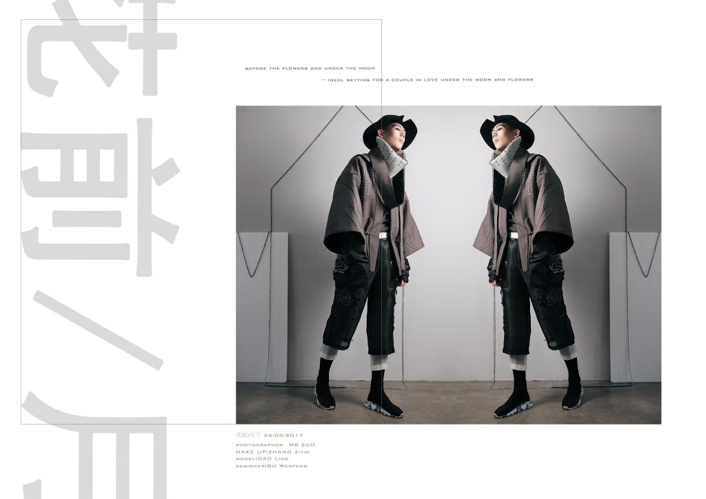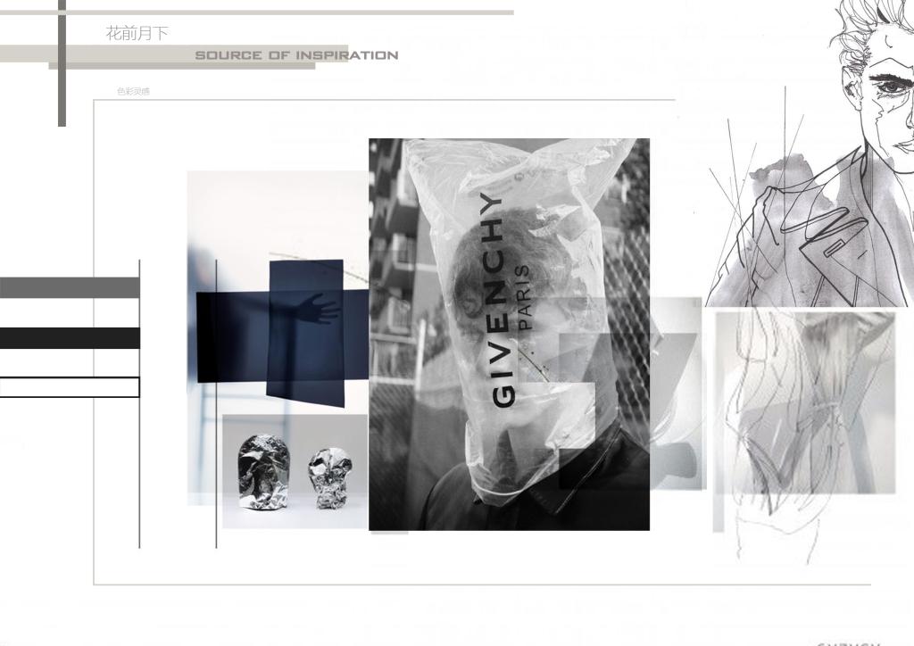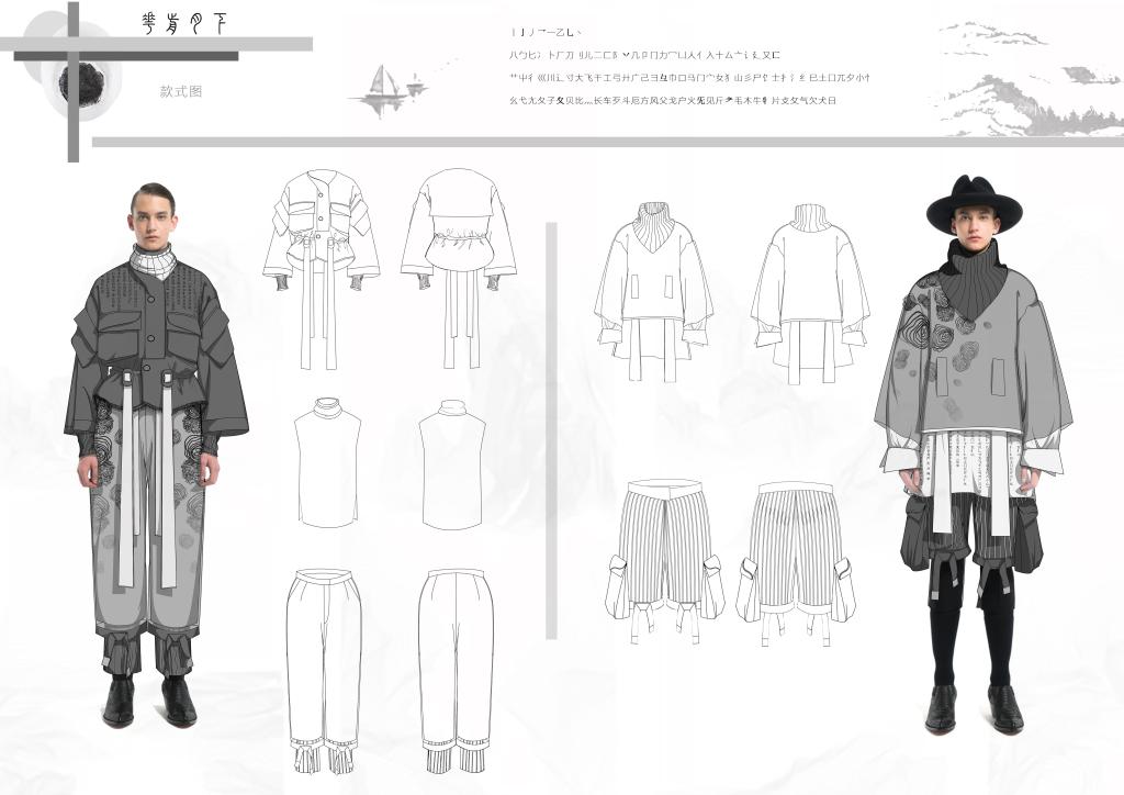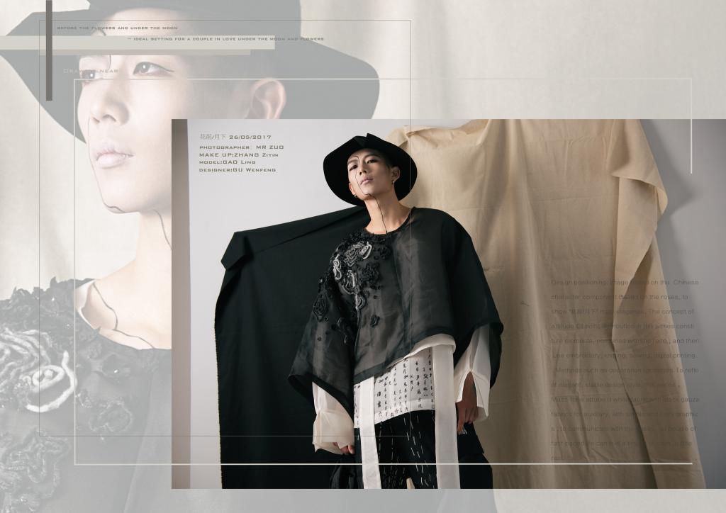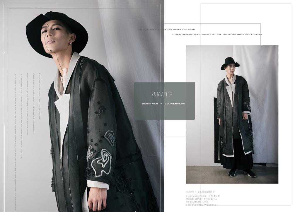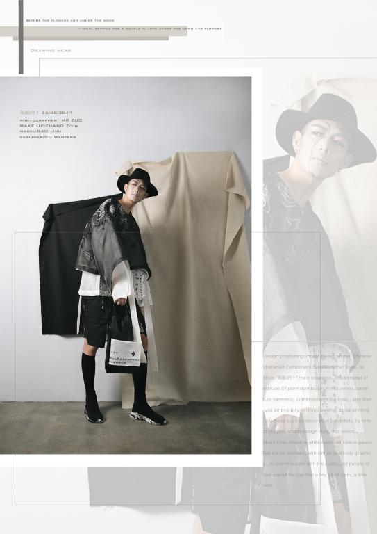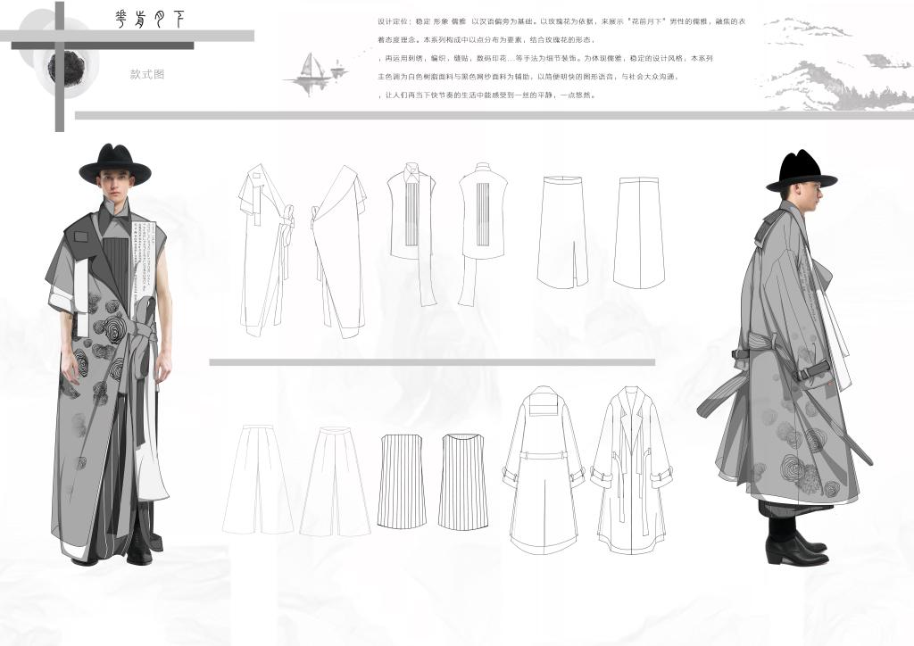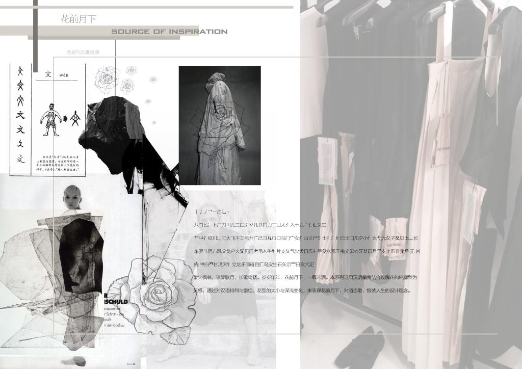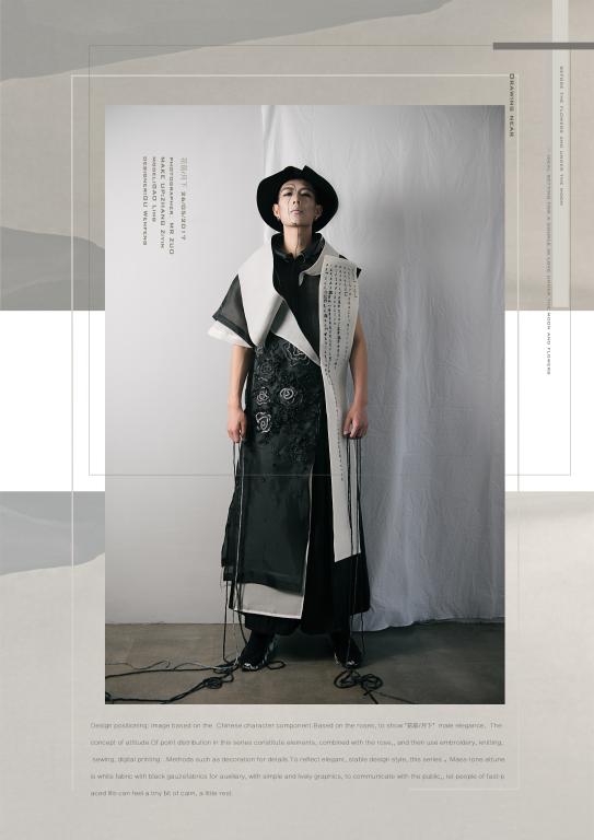 设计说明:稳定 形象 儒雅 以汉语偏旁为基础。以玫瑰花为依据,来展示“花前月下”男性的儒雅,融焦的衣着态度理念。本系列构成中以点分布为要素,结合玫瑰花的形态,再运用刺绣,编织,缝贴...等手法为细节装饰。为体现儒雅,稳定的设计风格,本系主色调为真丝绡面料与黑色欧根纱面料为辅助,以简便明快的图形语音,与社会大众沟通,让人们再当下快节奏的生活中能感受到一丝的平静,一点悠然。