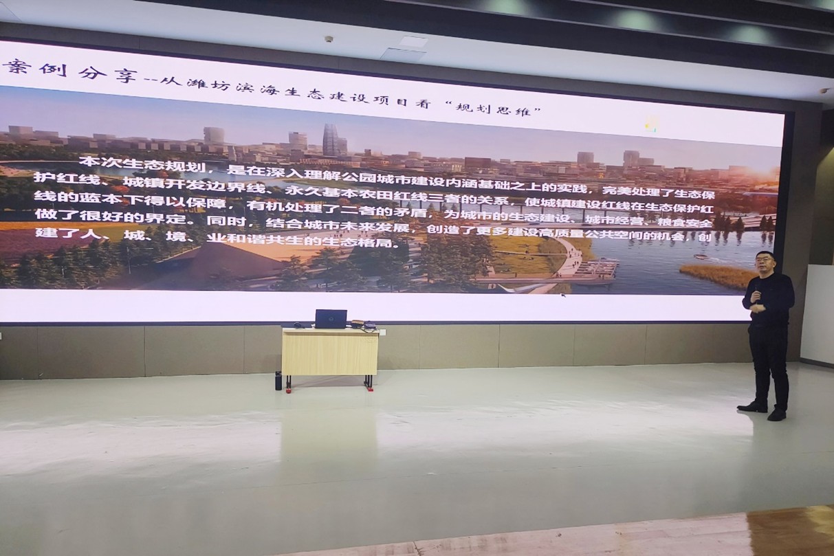 讲座伊始,任院长就风景园林专业的发展前景及个人专业能力的提升方法做了阐述,提出了专业思维方式要从“补丁思维”转化为“规划思维”,积极拓展专业实践外延,提升综合业务能力。任院长结合潍坊滨海生态建设项目,对“规划思维”进行了更加深入的解读。任院长以“青华手绘”为例子,专门强调了坚持手绘在设计专业素养培育中的重要作用,他建议同学们要从思想认知、专业素养、日常积累以及产教结合几个方面不断学习积淀,充实自己。
