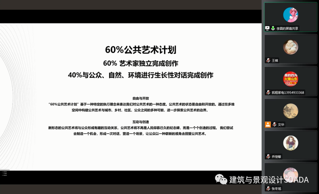 为积极推进我院课程改革与专业建设工作,拓宽师生们的学术视野,2022年9月18日上午,由建筑与景观设计学院邀请,中央美术学院中国公共艺术研究中心项目主任李震教授通过腾讯会议为我院师生带来了名为《中央美术学院-公共艺术与空间设计工作室的教学与实践》线上学术讲座。本次讲座由教务处和建筑与景观设计学院主办,是学校博雅论坛系列活动之一,也是建筑与景观设计学院“艺+建”论坛系列学术活动之一。讲座由建筑与景观设计学院院长李文华教授主持,近200人参加活动。参会人员除本院教师和部分学生外,还有来自兄弟院校的相关专家学者。