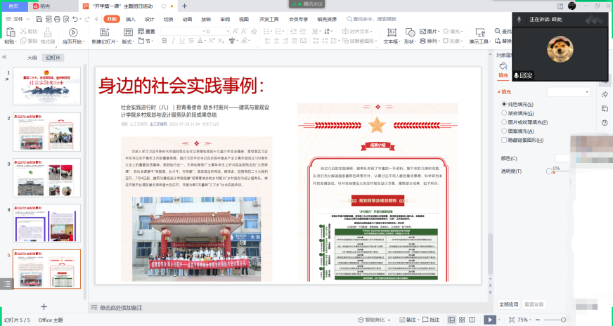 9月4日,建筑与景观设计学院团总支组织全体学生开展线上“社会实践话归来”活动,活动中,学院11支实践团队代表以演讲和ppt展示的形式,与大家一起分享在志愿服务、乡村振兴、传承红色精神、党史学习教育等实践中的经历和自身感悟。