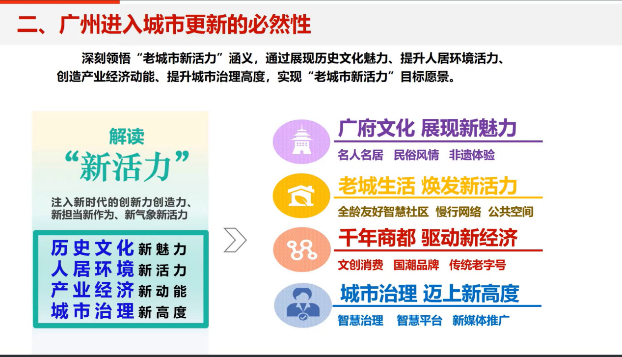 本次讲座主要从城市更新的内涵、广州进入城市更新的必然性、共同缔造下的社区微改造、社区微改造实践案例四个方面展开。骆建云提到“城市是生命体、有机体,要敬畏城市、善待城市”,要“努力探索超大城市现代化治理新路子”。广州市是最早从政府这个层面系统性地开展老旧小区改造工作的城市,骆建云介绍了广州市旧城空间布局演变的历程和城市发展过程中旧城存在的问题,从三方面探讨了广州进入城市更新的必然性,提出社区更新是旧城更新的核心工作。
