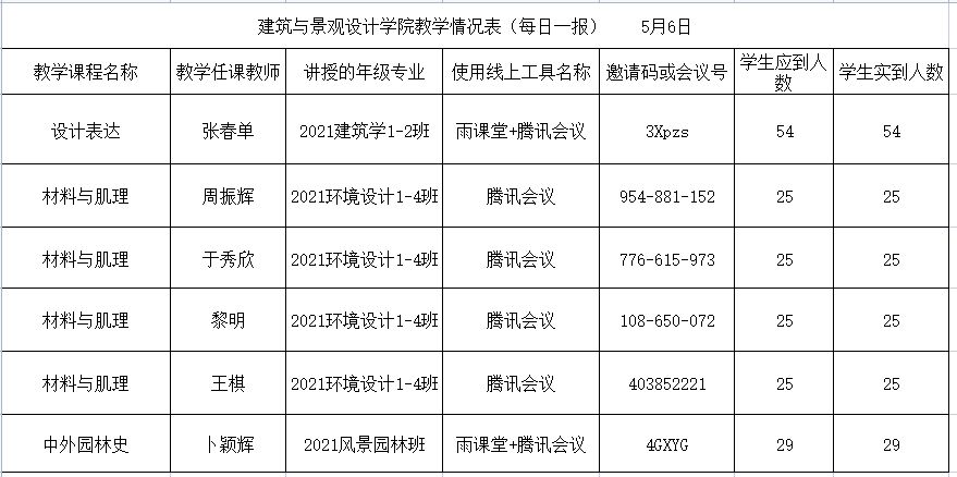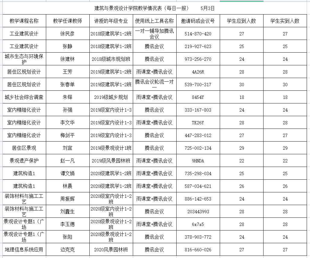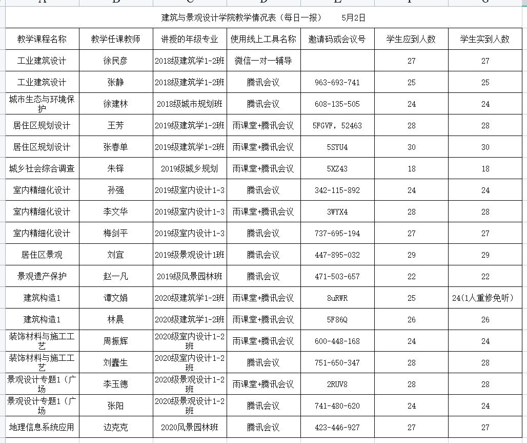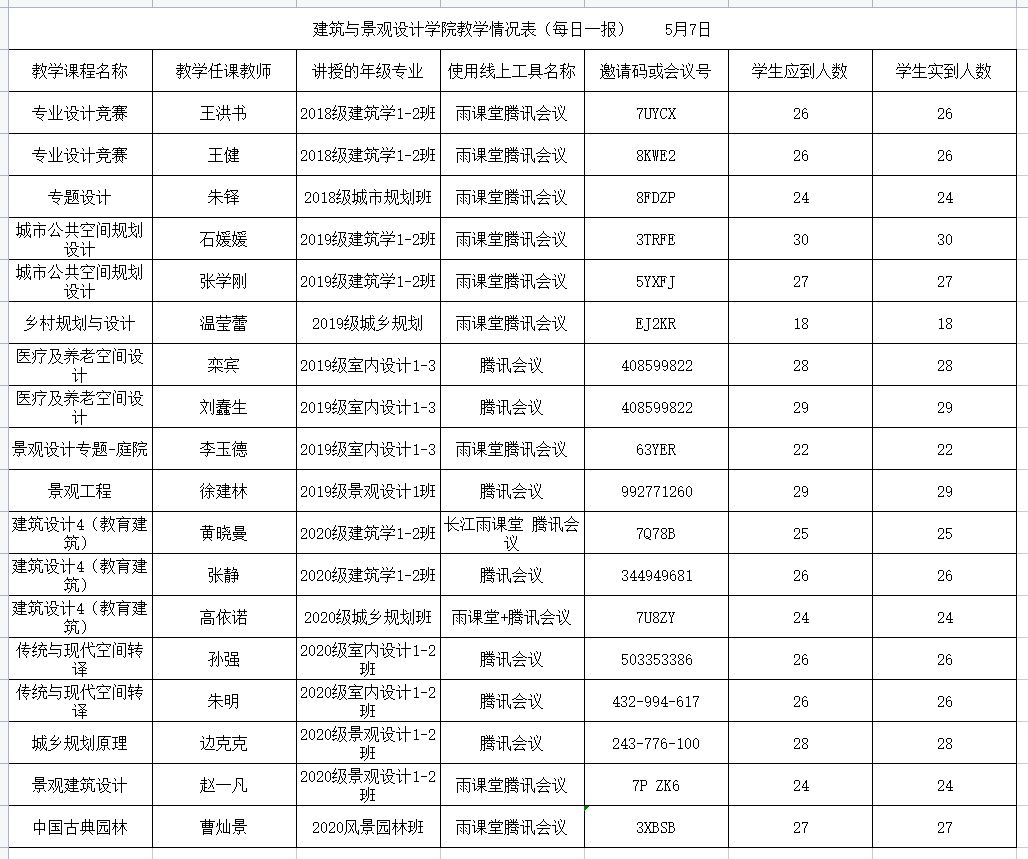 据统计,第六周线上教学以来,建筑与景观设计学院共有26门课程实施在线教学,29位老师参与线上授课,教师到课率100%,学生应到总人数646,实到人数646,学生平均到课率为100%。