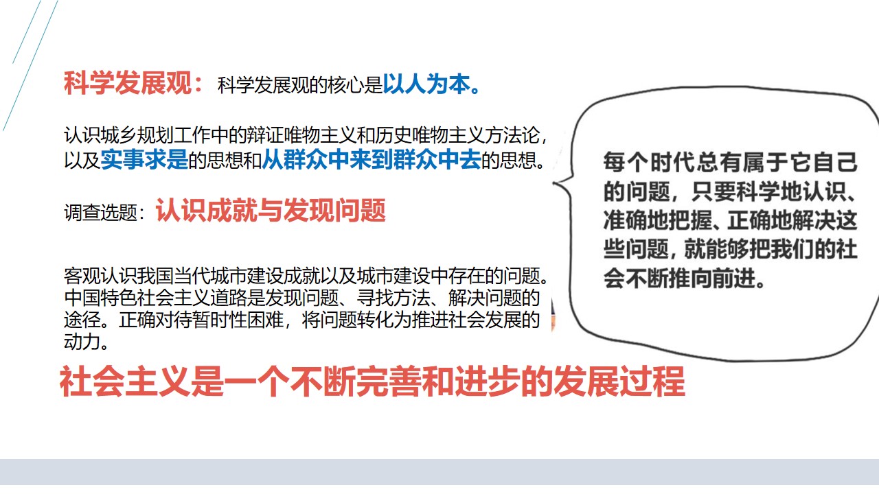 基于课程特点,教学内容充分结合思政教育。朱铎引导学生学习城乡规划工作中的辩证唯物主义和历史唯物主义方法论,了解实事求是和从群众中来到群众中去的思想。在调查选题环节,带领学生客观面对我国当代城市建设成就以及城市建设中存在的问题,认识到实现社会主义现代化是一个不断完善和进步的发展过程,中国特色社会主义道路是发现问题、寻找方法、解决问题的途径,学生们应该具有将问题转化为推进社会发展的动力的意识。