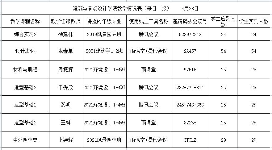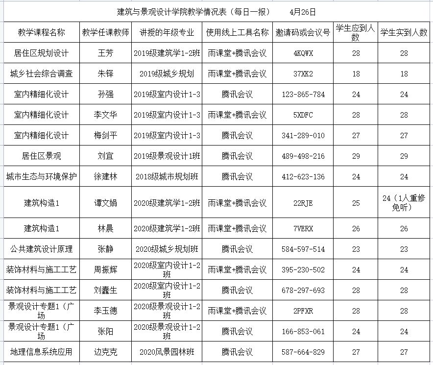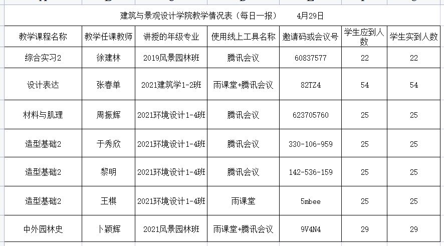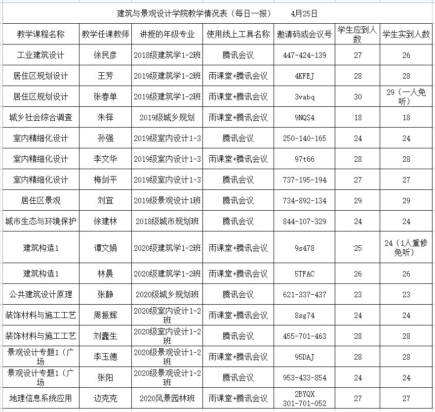 据统计,第五周线上教学以来,建筑与景观设计学院共有16门课程实施在线教学,21位老师参与线上授课,教师到课率100%,学生应到总人数645,实到人数644,学生平均到课率为99.84%。