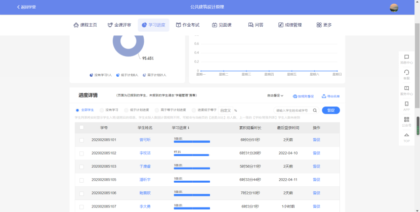 绝大部分同学都能在开课前观看完视频授课内容,并能够结合每一章、每一节的知识要点完成视频弹题、章测试和讨论题。