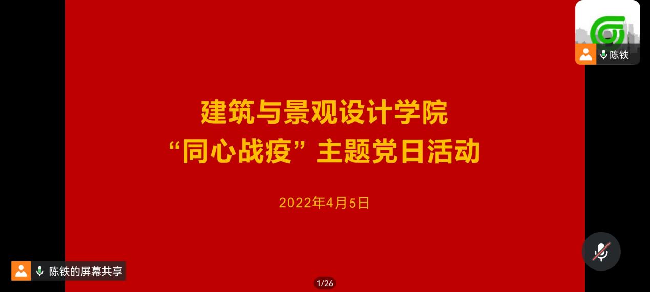 为弘扬抗疫精神,引导学生党员传承红色基因,进一步加强爱国主义教育,4月5日,建筑与景观设计学院学生党支部开展线上“同心战役”主题党日活动,观看抗疫电影《中国医生》。活动由学生第二党支部书记陈铁主持,党总支副书记姜华列席指导,学生第一党支部书记褚丁庆、辅导员韩晓旭参加。