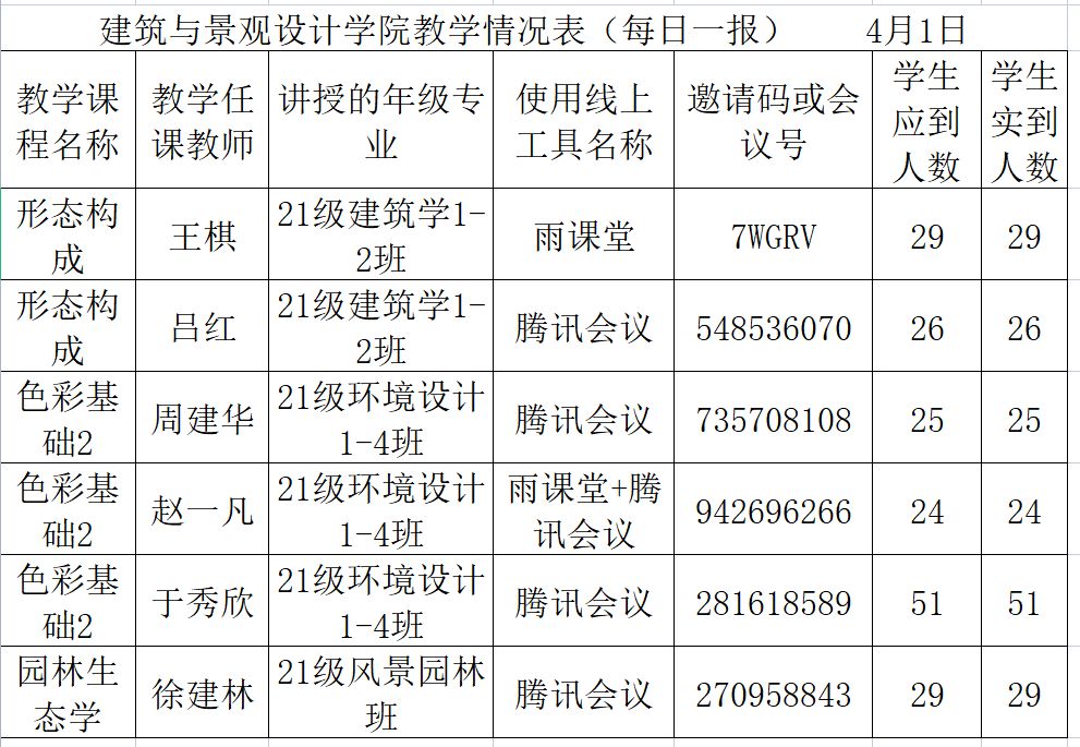 3月31日-4月1日,建筑与景观设计学院共开设《形态构成》《造型基础》《园林生态学》3门课程,周建华、于秀新、赵一凡、徐建林、吕红、王棋六位老师负责授课。2021级共175名同学参加了线上学习。教师到课率为100%,学生到课率也为100%。
