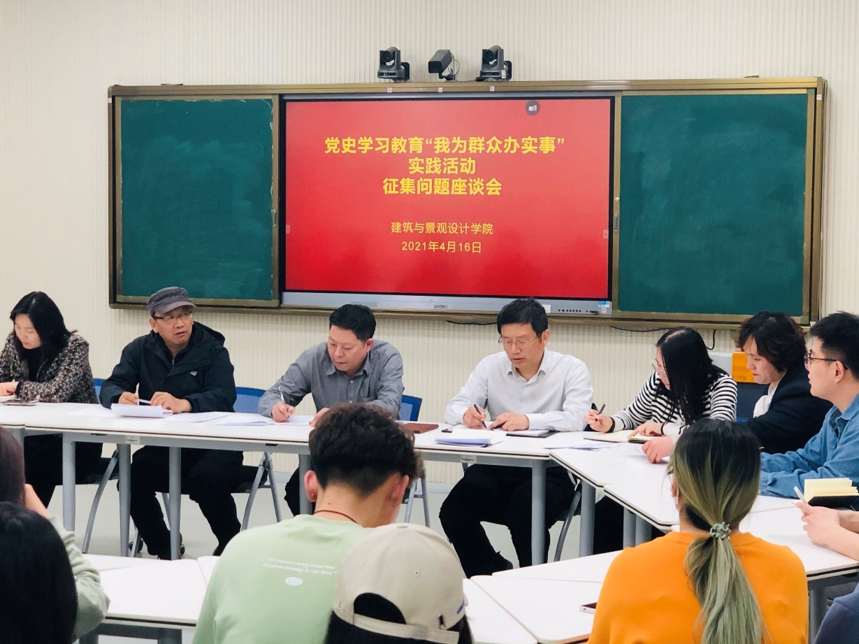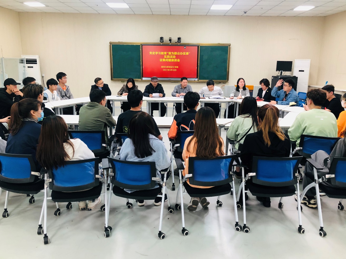 4月16日,建筑与景观设计学院党史学习教育“我为群众办实事”实践活动座谈会,征求同学们的意见建议,党委委员、党委组织部部长许磊、学生处处长张军波、团委副书记孙艳丽、山东明德物业管理集团总公司2025新澳门免费原料大全项目部学生公寓主管徐楠、辅导员褚丁庆、陈铁参加会议,党总支书记张东深主持会议。