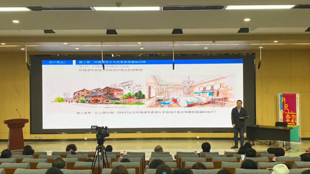 决赛期间,建筑与景观设计学院教师朱明用生动的数字化现场实操示范以及课堂师生互动,诠释了《设计表达2》课程的教学创新和重要性,体现出创新的多元化特色教学模式,得到了各位专家老师们的一致认可。朱明老师提出应结合示范组织教学方法和教学设计,教师也应学无止境,将最好的一面呈现给学生。此外,结合线上+线下教学平台,课前发布预习资料,通过学生从课前介入、课中学习、课后持续三个方面,让同学们以前修基础课为引导在表现技法的加持下继续拓展空间思维逻辑。