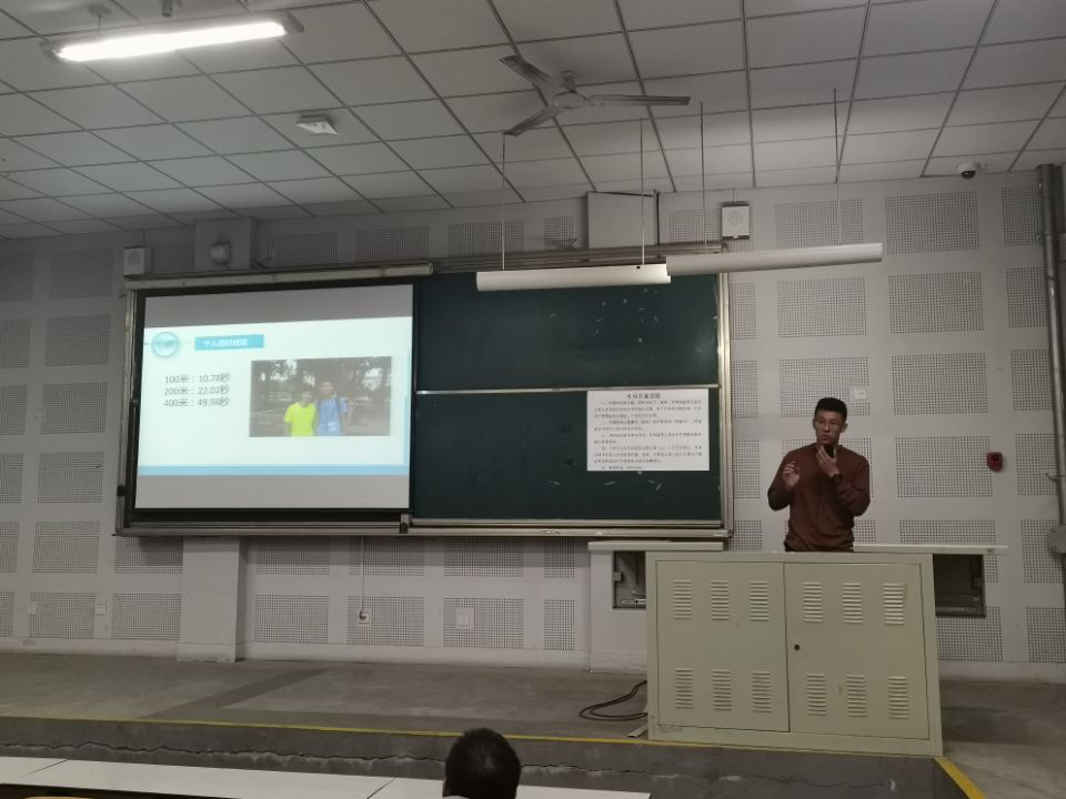 接下来,陈铁老师向同学们介绍了新任辅导员田亚洲老师。田亚洲老师与同学们继续交流,他首先介绍了自己的专业情况和运动经历,分享了自己本硕七年的学习和训练生活,接下来对2019级同学提出了四点要求:1、要有集体主义精神;2、讲纪律,严守校规校纪;3、做好自己,搞好学习,培养自己的兴趣爱好;4、换位思考,相互理解,团结友爱,互相帮助。最后田老师鼓励同学们走出宿舍,多参加体育活动,锻炼身体,并从营养学的角度,以“如何在不运动的情况下科学减肥”为题进行了科普,拉进了学生与老师间的距离,增添了信任感。