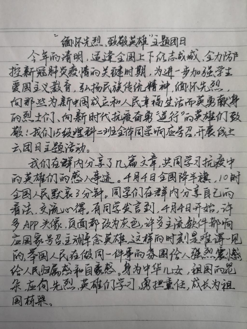 15级城乡规划班翟悦含:冬去春来,又是一年清明至,又到缅怀先烈时。无数先烈为民族独立和人民解放,为国家富强和人民幸福建立了卓著的功勋,我们要铭记光辉历史、传承红色基因,努力为实现中华民族伟大复兴贡献自己的一份力量。