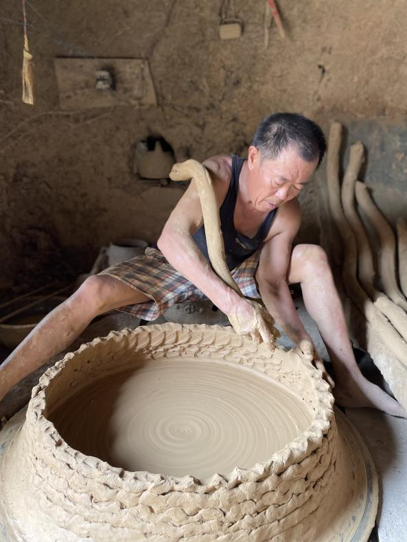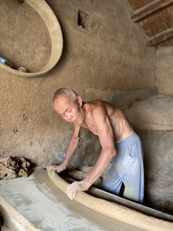 之后,团队来到柘沟镇山东儒陶工艺制品有限公司,实践调研了鲁柘砚传统工艺在企业文化输出中的创新发展,企业负责人带我们参观学习了鲁柘砚的生产流水线,拜访了当地有名的拉坯传承大师刘静杰老先生,通过与刘静杰老先生的交流得知,他是家族里柘沟大缸的第五代传人,至今都坚持拉坯烧窑。