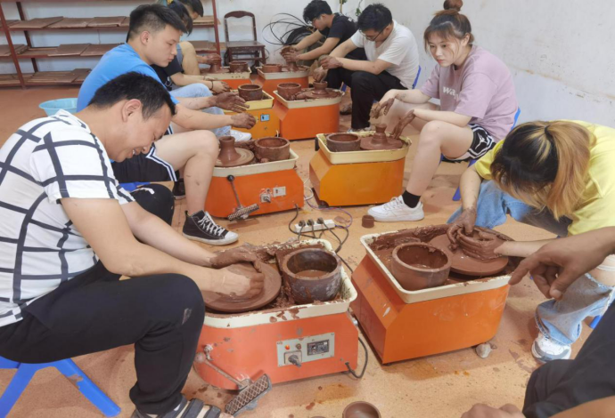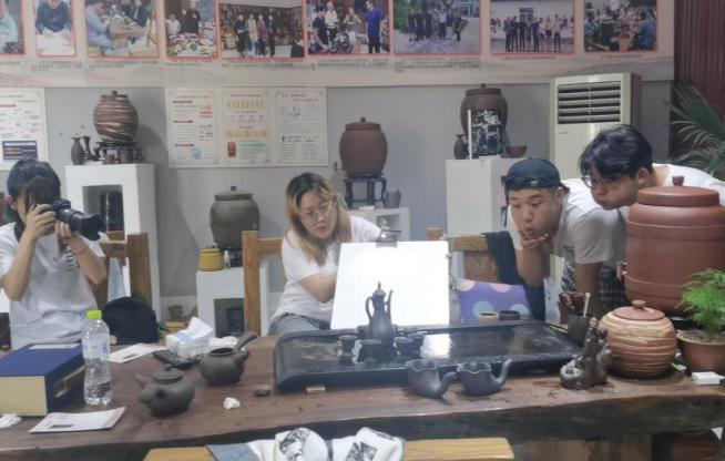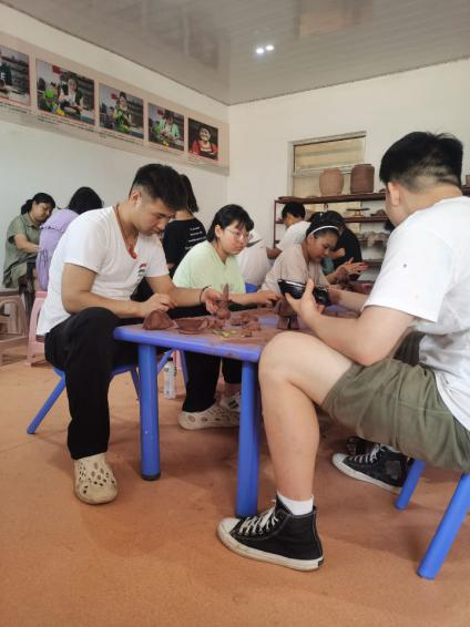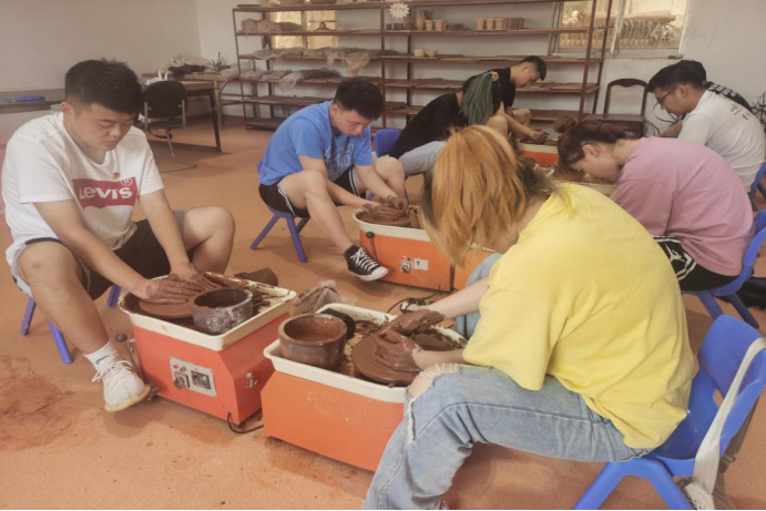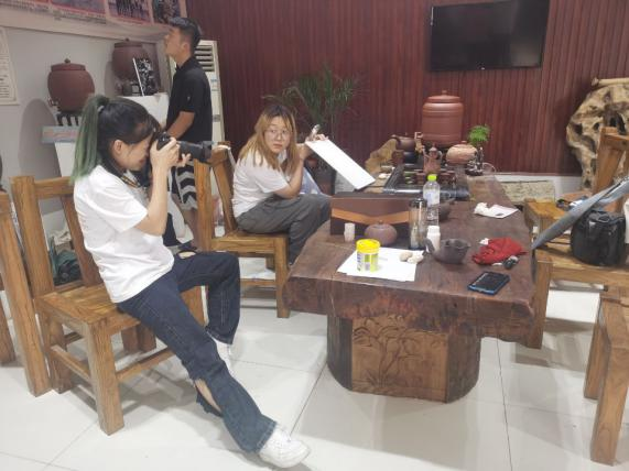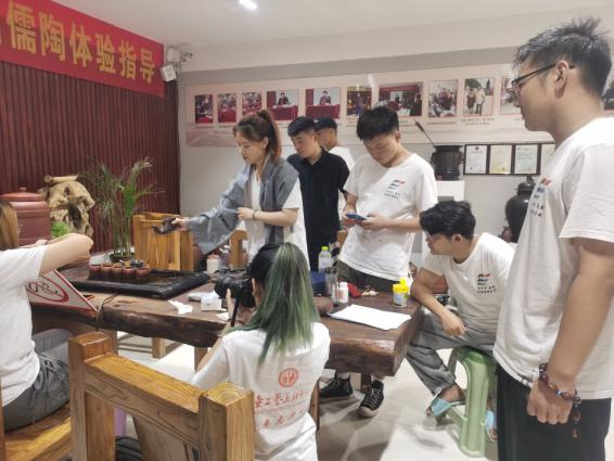 为更好地发现问题、解决问题,更具有针对性的帮扶企业“走出去”,实践团成员在公司设计师吕老师的指导下,走进儒陶的生产线中。吕老师带领团队成员从原材料的选择到出售都进行了详细的讲解,非遗传承人马修赛老师带领团队成员亲身体验儒陶工艺的制作流程。手指的触感能感受到陶土的质朴,烧制成型的陶器会让人切实感受到浴火重生真实内涵。