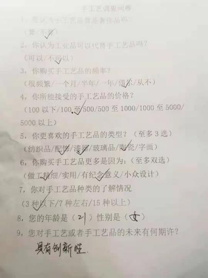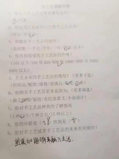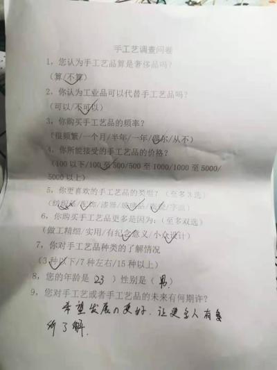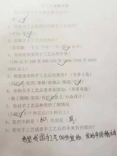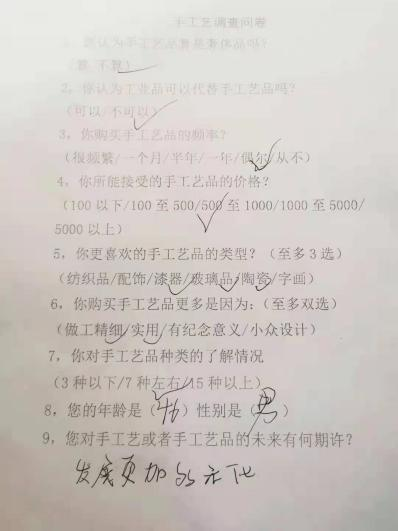 我们的调查问卷内容包括对手工艺的认知情况,手工艺品的发展瓶颈,以及大家对手工艺品的憧憬,我们共往外发出了200余份问卷,并且在每个调查问卷做完后还会发给他们一份我们设计制作的宣传册。 (如图53、54)