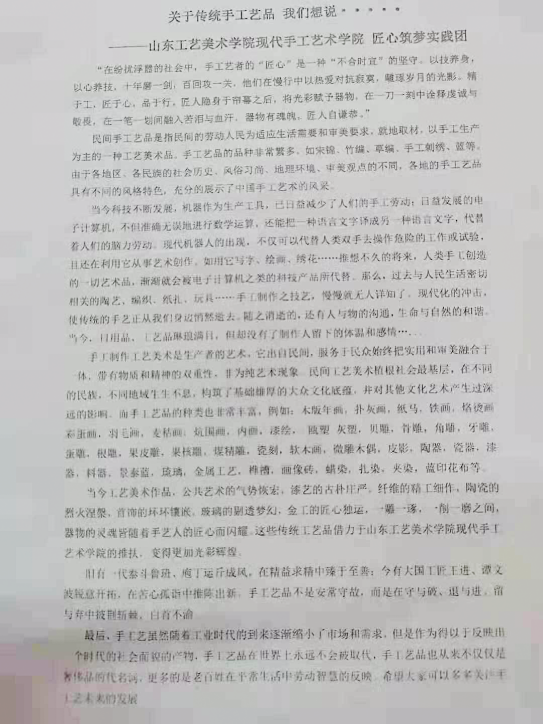 在社会实践过程中,“匠心筑梦”实践团与济南街区的一些工艺美术大师进行交流沟通,并凭借专业特色、专业优势与其构建合作关系,既有利于我们自身专业的学习又可以呼吁新时代青年携手弘扬传统工艺。实践团将线上线下相结合,通过制作调查问卷,制作宣传手册、工艺品制作等形式宣扬工艺美术文化,依托自媒体平台将古老的工艺技术与坚守初心的工艺匠人传承发扬出去,助力工艺美术融入到人民群众的衣食住行中。