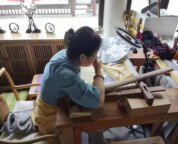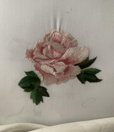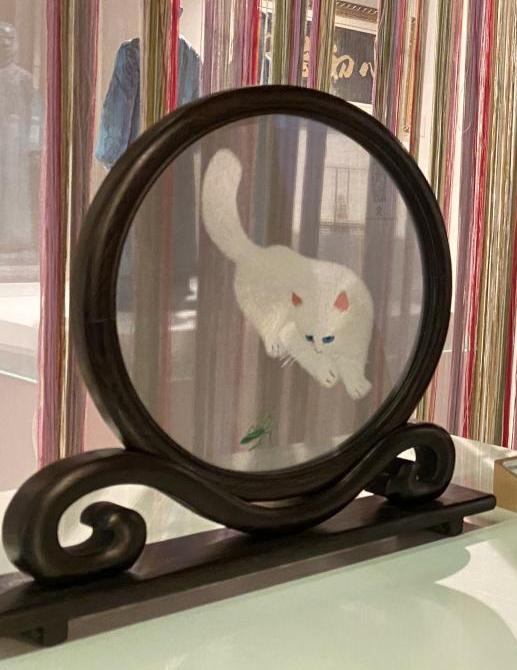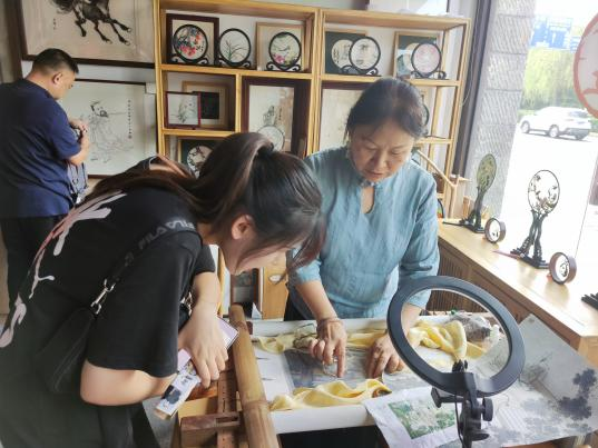 戎老师着重给我们介绍了发丝绣,“发丝绣”是将头发和生丝相结合进行绣制,其中发丝为专业处理过的头发,生丝则属于蚕丝的一种原料。以生丝为主,发为辅,这是鲁绣唯独有的特点。