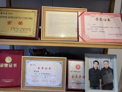 图26 梁长乐老师所获得的奖状证书以及其金奖作品《风调雨顺》