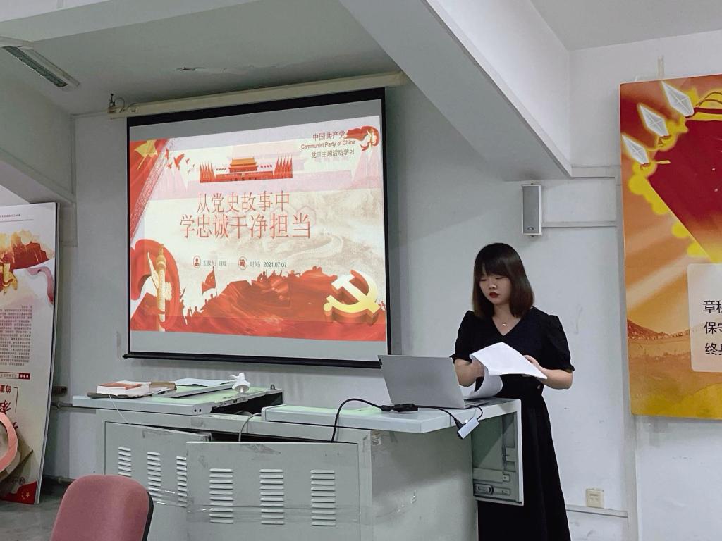 为讲好党史故事,传承红色基因,提升党员党性修养,2021年7月6日,现代手工艺术学院学生党支部书记田媛在B444多媒体教室为学院党员、入党积极分子讲授《从党史故事中学忠诚干净担当》党史学习教育专题党课。
