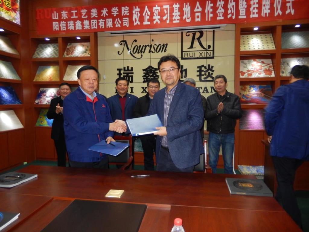 11月20日,山东省工艺美术学院与阳信瑞鑫集团有限公司校企实习基地合作协议暨挂牌仪式在瑞鑫集团中国地毯文化艺术博物馆举行。阳信县委组织部长田洪刚参加签约,阳信县委书记栾兴刚参会加座谈。