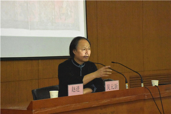 邰立平老师的讲座题目是“陕西凤翔木板年画的传承和创新”。邰老师是凤翔邰氏年画的第二十代传人,六岁便随祖父学习家传技艺。邰老师首先讲述了凤翔木板年画始于唐宋、盛于明清的历史。后又回忆了十年浩劫对凤翔木板年画的影响,以及七十年代末邰老师与父亲对流散民间的古样进行挖掘、整理、研究和复制的历程。其后,邰老师按照门神门画、吉祥喜庆、戏曲故事、民俗生活以及纸马的分类,依次向我们展示了山西凤翔木板年画的代表作品,使大家充分领略到了陕西木板年画古朴自然的独特风格。最后,邰老师详细讲解了木板年画从起稿、号色、推版、贴版到站版、起版、刻版、加纸、印刷的制作工艺流程。