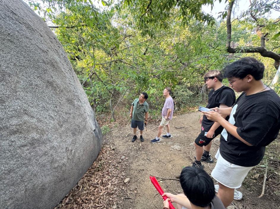 团队爬上邹城岗山。岗山摩崖刻石是书法界、文化界关注的焦点。书法风格篆隶楷相参,结体奇特,充满古朴、雄浑之美,在我国书法史上占据重要地位,对研究北朝时期的佛教文化、书法艺术演变有极高价值。