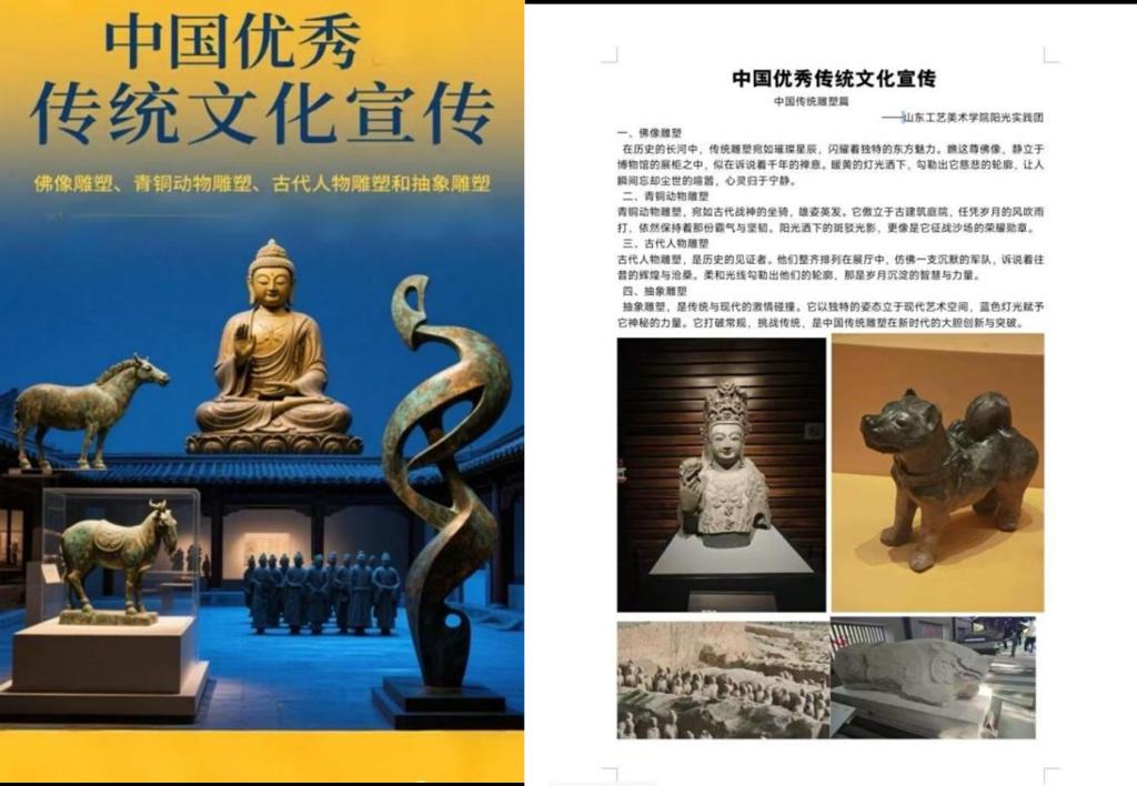 实践团队立足传统文化传承,系统梳理中国雕塑艺术的历史脉络与审美特质,深入基层开展文化普及,通过阐释雕塑作品的造型特征与文化价值,推动优秀传统艺术融入当代生活。同时进行作品展览,以图文展板与代表性复刻品为载体,结合现场解说还原不同时期的艺术风貌,增强人们的文化自信。活动既强化了群众对传统雕塑的认知认同,又提升了同学在阐释传统文化方面的能力,有效的拓展了传统文化传播半径,为艺术遗产的活化传承注入持续动能。