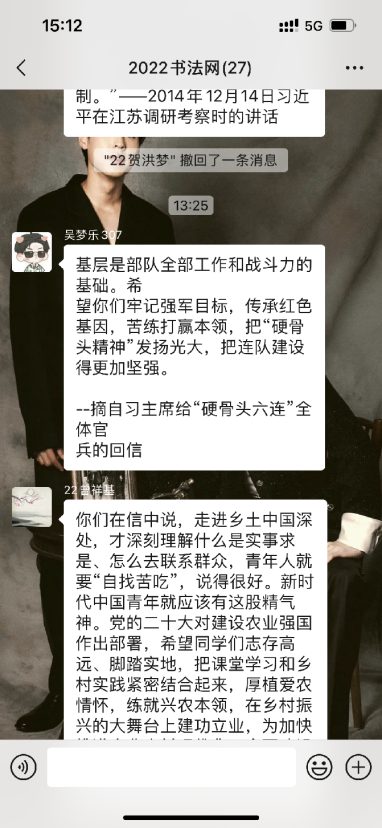 团总支文体委员许宸:作为新时代青年,我要以行践知,“走进乡土中国深处”,将理论学习和实践紧密结合,将回信精神落实到工作中,将不断强化实践活动与乡村振兴的关联。在认真学习书本知识的同时,充分结合共青团“三下乡”、“大学生社区实践计划”等活动,走出校门、走向田间地头,在乡村振兴实践的大课堂中了解国情社情民情,勇担时代责任,展现青年担当,将青春热血洒在祖国广袤的大地上,在助力国家乡村振兴宏伟实践中贡献青春力量。