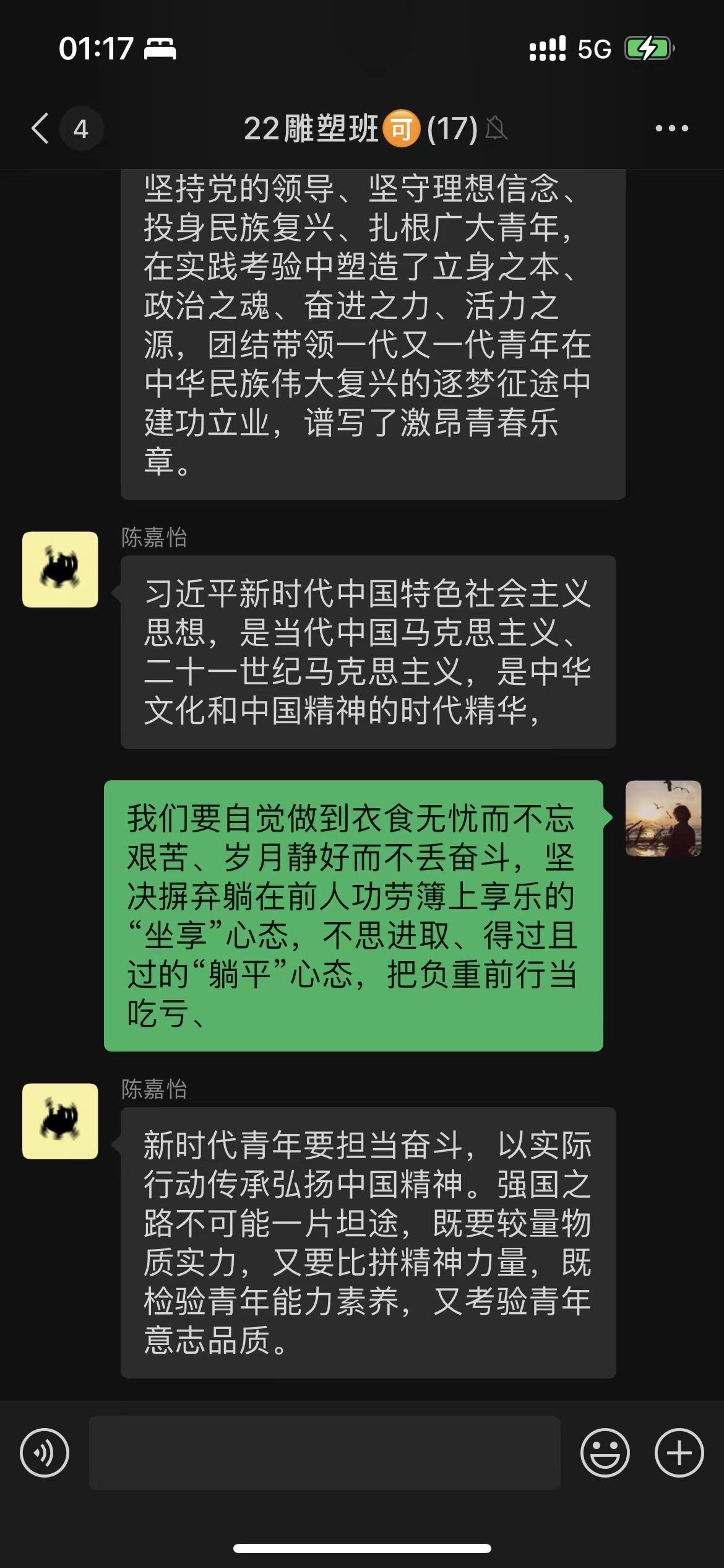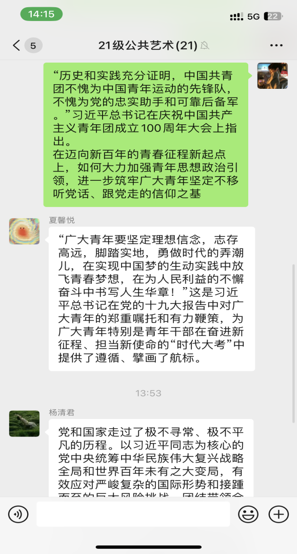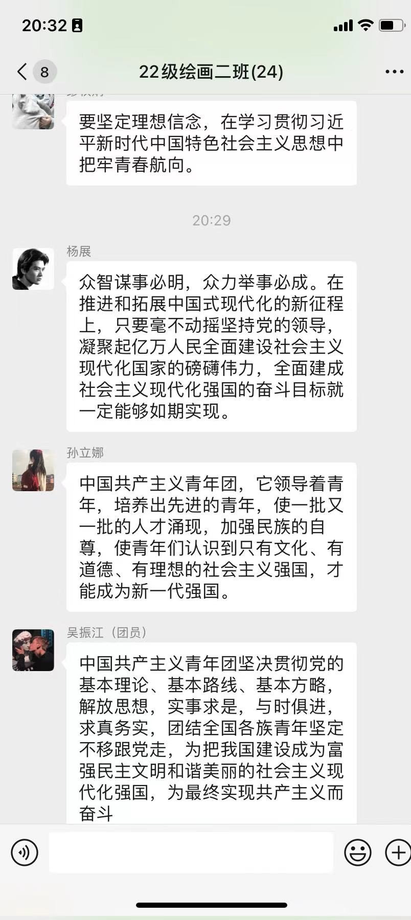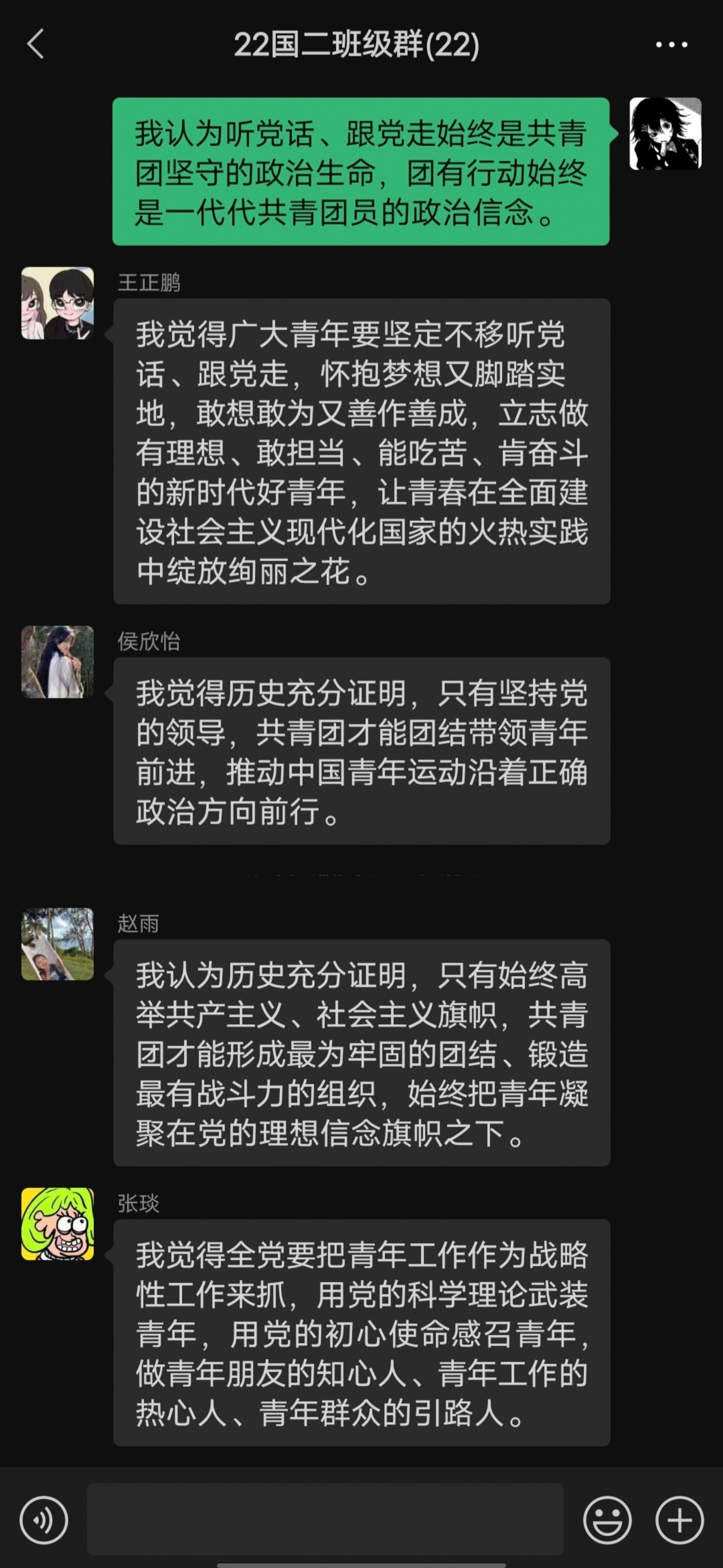 活动伊始,各团支部书记组织同学们集体观看中国共产主义青年团第十九次全国代表大会重要讲话,各团支部书记讲述此次活动对于青年团员的重要意义,并表明当代青年应在担当时代使命中彰显青春的使命,在推动时代进步中实现自身的进步,激励同学们在奋斗中实现人生价值。活动中同学们认真观看、细细品味讲话对于当代青年提出的要求和展望,品读新时代共青团的历史责任,感受共青团的伟大奋斗精神。会后,在团支部书记的发动下,同学们踊跃发言,交流探讨自己的心得与感悟,分享自己与共青团的小故事,讲述自己对于奋斗的理解,品读大会的重要内容和精神。