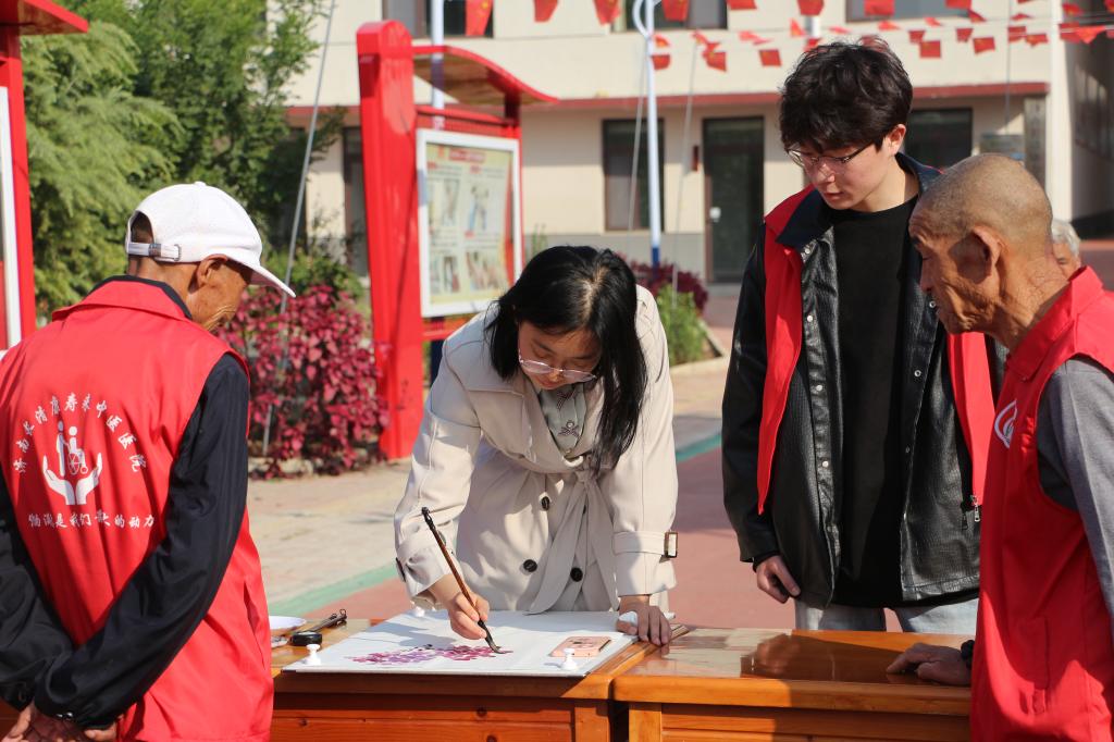 活动伊始,志愿者们分成三组,分别与有关工作人员了解各位老人的性格特点、生活习惯和健康情况,以便更好地开展志愿服务;提前布置活动场地,准备好书画用具;和养老院负责人一起将老人们聚集起来,给老人们分发水果和礼物。活动现场,每一位志愿者亲切地与老人们沟通交流,并送上重阳节祝福,将关怀和温暖送到每位长者的心中去。随后,志愿者将画纸铺开,将体力和思维运用于笔端,认真勾勒绘制国画作品,并给老人仔细地讲解作品。活动中老人们积极踊跃参与,老人们与志愿者们共同完成了一幅书法作品。双方进行了书画方面的交流,其乐融融,为敬老院增添了生机与活力。此外,志愿者们向老人们学习敲锣、打鼓和扭秧歌,并且与老人们一起舞动扇子,排成队列,开心起舞。志愿者们的多种服务内容让老人们在尊老敬老中有获得感和幸福感,这也是此次活动的目的之一。至此,造型艺术学院本次重阳节敬老志愿服务活动圆满结束。