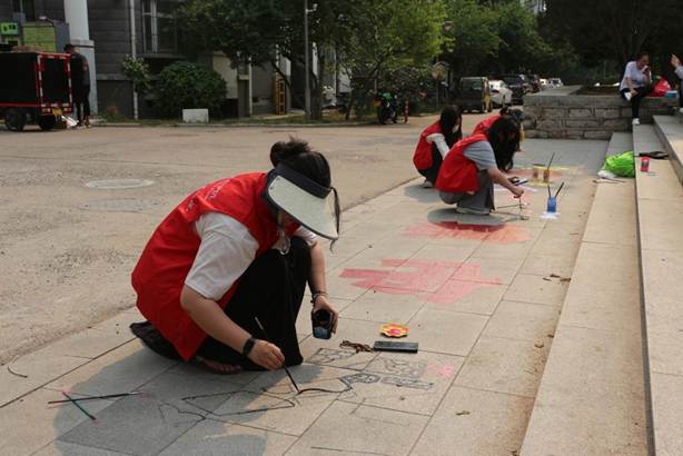活动接近尾声,经过大家的精心创作,原本单调的地面焕然一新,成为社区一道亮丽的文化风景线。紫薇阁社区负责人高度评价道:"此次活动不仅提升了社区环境品质,更以艺术形式润物无声地传播了文明理念。同学们展现出精湛的艺术素养和团队协作能力,这种校社联动的创新模式,既拓展了大学生社会实践的深度,也增强了社区居民的归属感。"