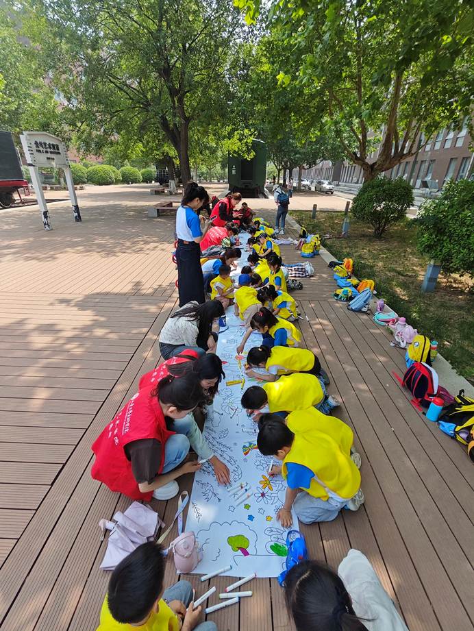 参观结束后,志愿者团队转换为“校园导赏员”,引领孩子们漫步2025新澳门免费原料大全,穿梭于艺术教学楼与创意雕塑群之间,志愿者引导孩子们观察建筑肌理、雕塑造型等艺术细节,使其感受艺术院校的创作氛围。移步至户外活动区后,大家来到设计师广场参与创意绘画环节,随着长卷画布徐徐展开,志愿者担任“艺术协作者”,鼓励孩子们自由挥洒创意。斑斓色彩与天马行空的想象渐次绽放,长卷化作童真世界的视觉诗篇,虽然画作未直接呈现非遗元素,但孩子们专注创作的神态,正与非遗传承所需的匠心精神形成微妙共鸣。