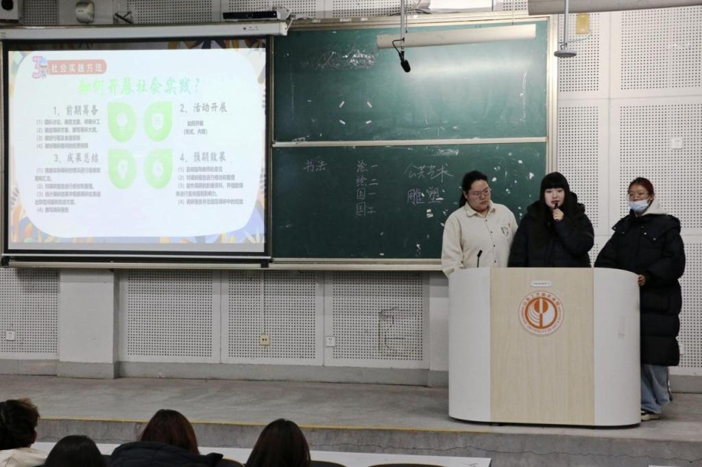 团课伊始,文体委员於永卓从社会实践含义与意义以及其重要性与必要性展开讲解。於永卓强调要将党的先进理论与实践相结合,并鼓励新生积极参加社会实践,为向职场过渡,增强就业优势等方面打牢基础。随后,青年委员杨泽轩向新生们介绍了丰富的社会实践内容,并从不同的社会实践类型及开展方式进行深入讲解,着重说明同学们需在社会实践中根据自身专业要求及兴趣爱好选择社会实践种类,激发了同学们的创造力和热情。